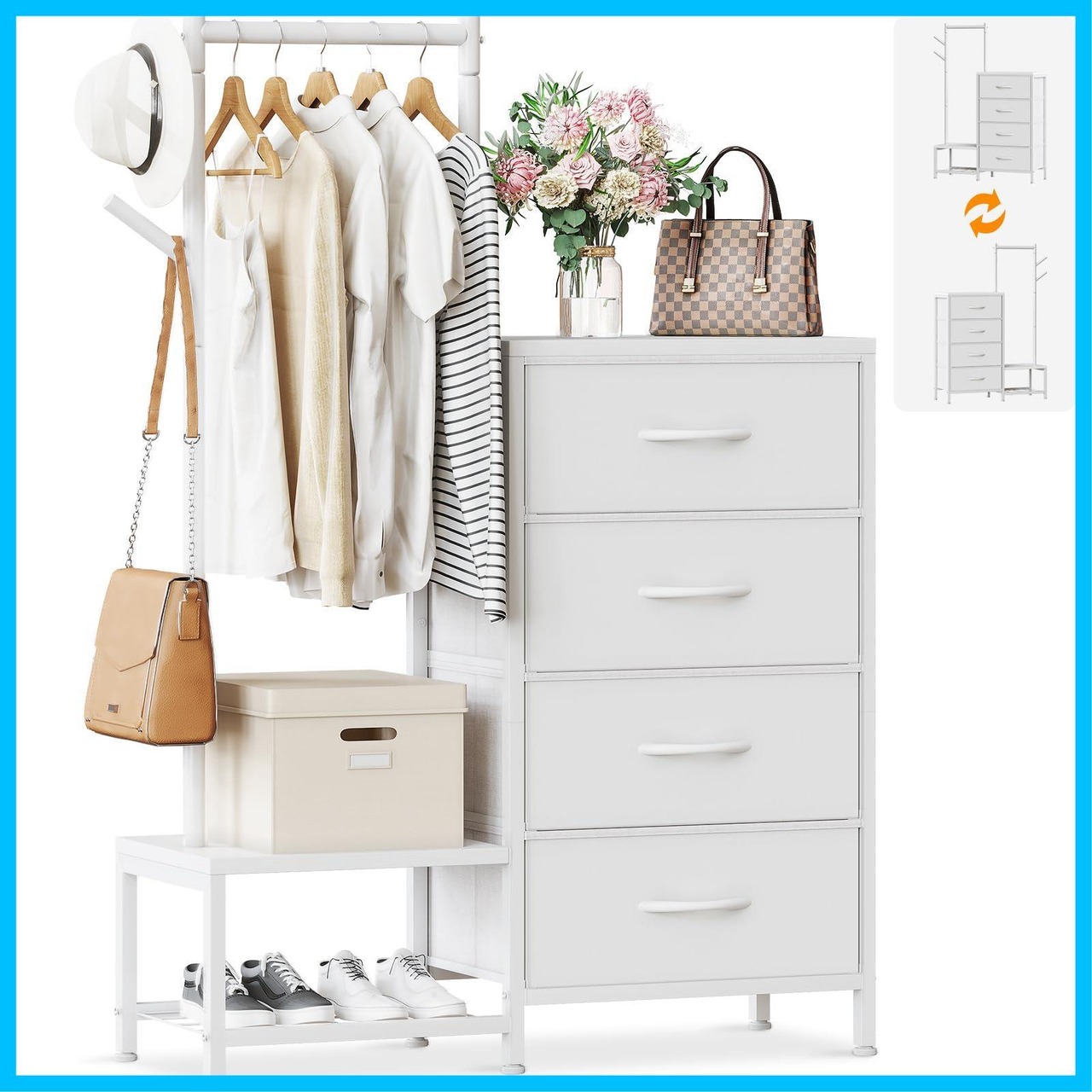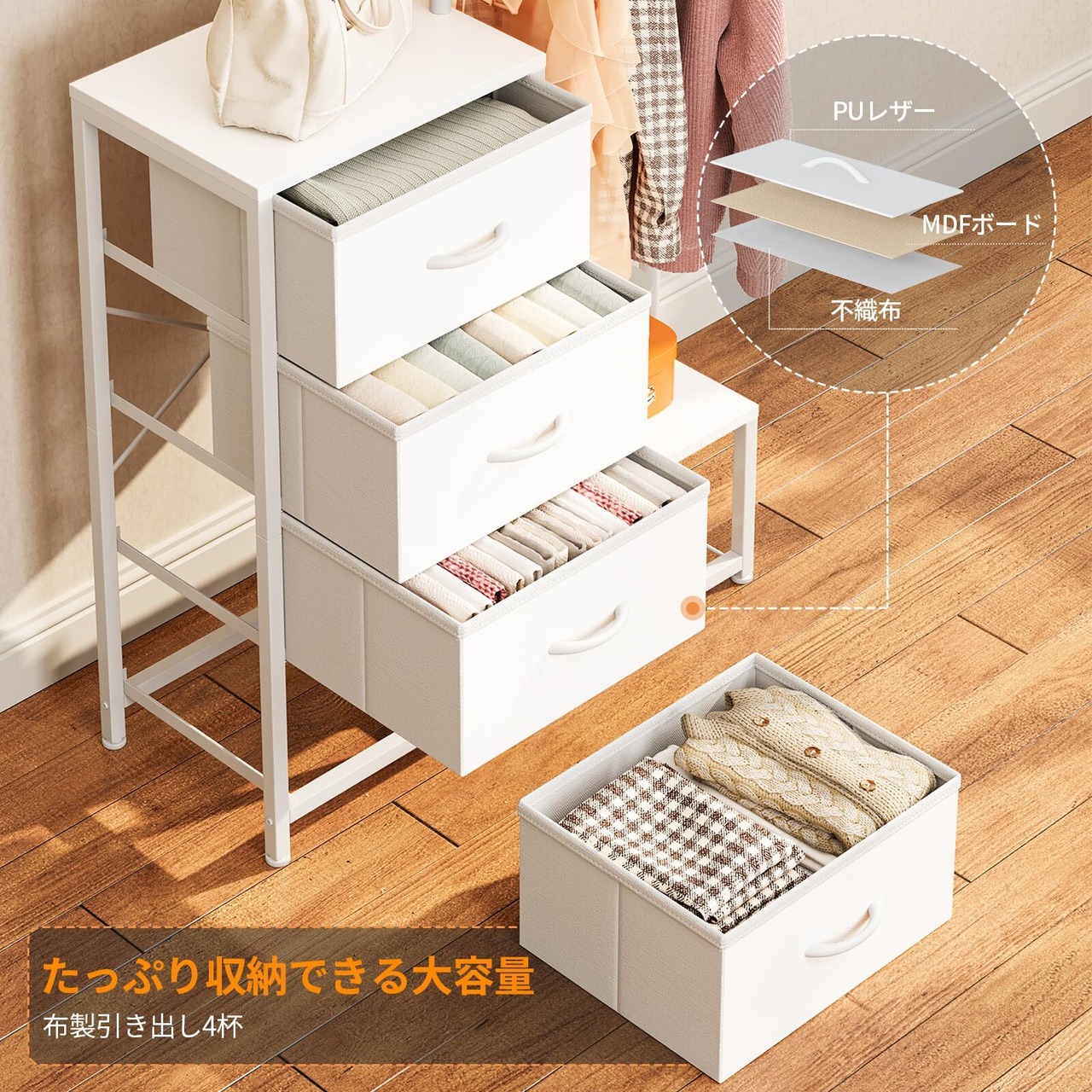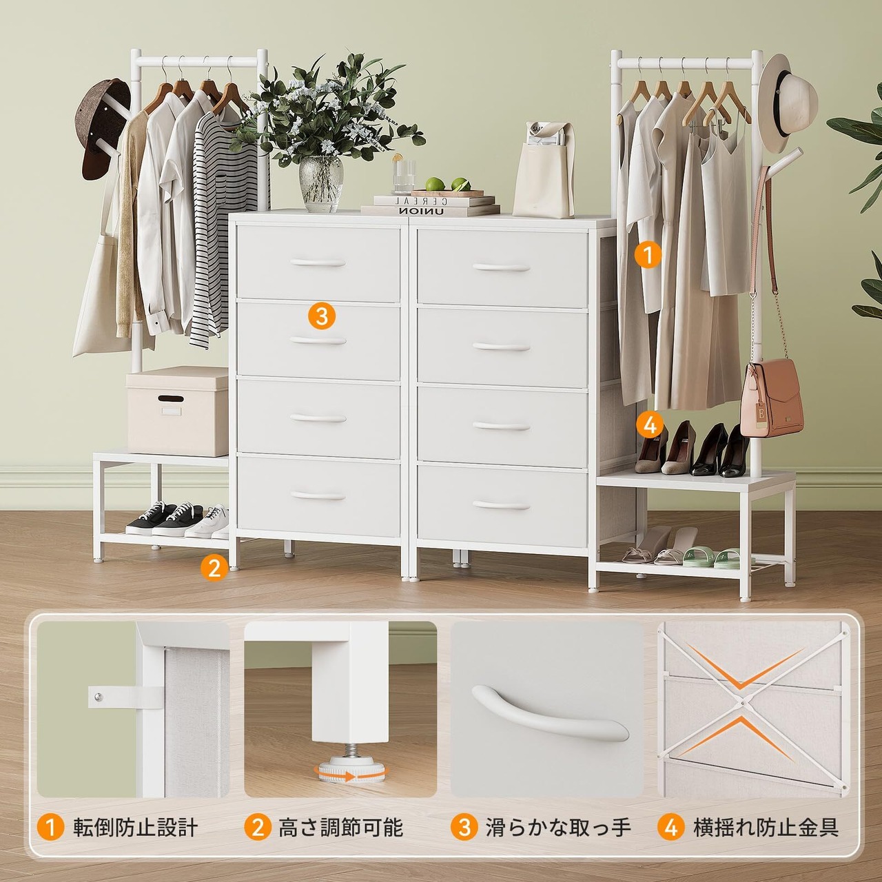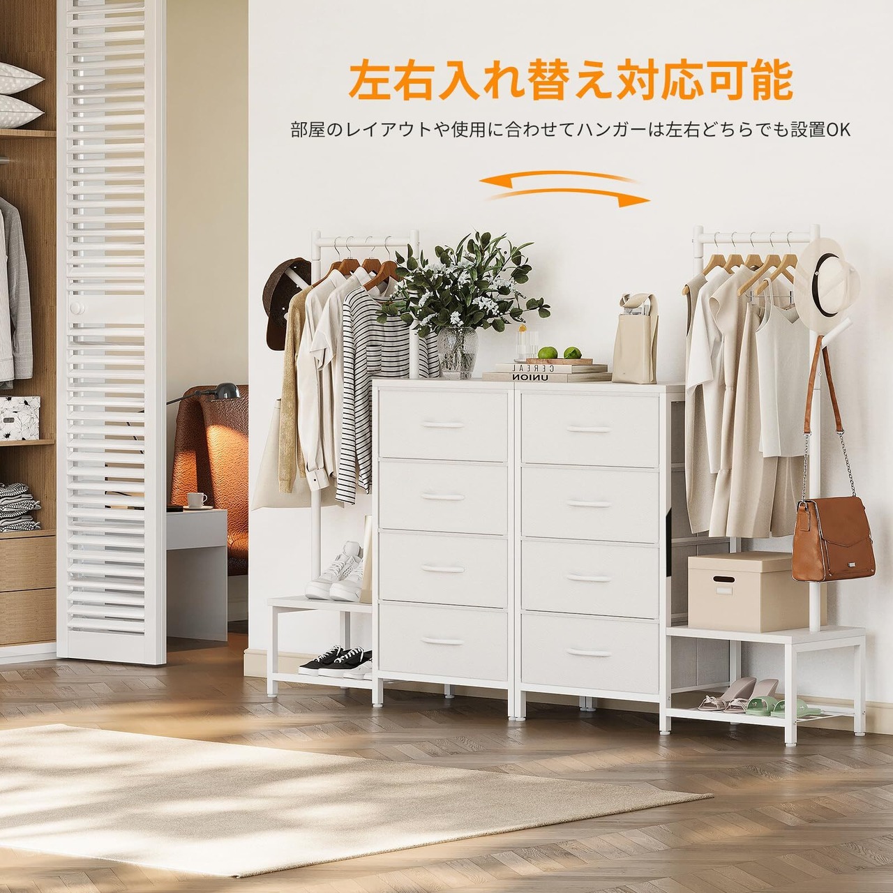 【在庫処分】AODK ハンガーラック 布製引き出し付き ワードローブ チェスト タンス 4段 幅75×奥行30cm 洋服収納 衣装棚 パイプハンガー 省スペース 頑丈 おしゃれ 組立簡単 ホワイト