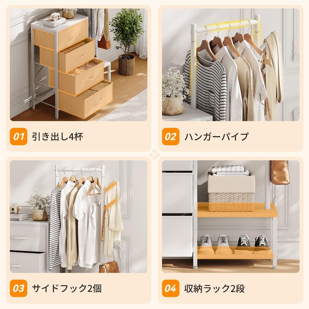 【3WAY収納(掛ける・置く・しまう)で空間を有効活用】このハンガーラックは、多様な収納ニーズに対応。限られたスペースでも効率的にご利用いただけます。①4段チェスト:MDFボードを内蔵した布製引き出しは重い物を収納しても型崩れしにくい。通気性に優れ、ほこりの侵入を防ぎ、プライバシーを保護することができる。②ハンガーパイプ:衣類のシワを防ぎ、一目で取り出しやすい。③サイドフック(2個付属):帽子やバッグなど毎日使うアイテムをサッと掛けて収納。④収納ラック(2段あり):小型のシューズラックとしても最適。