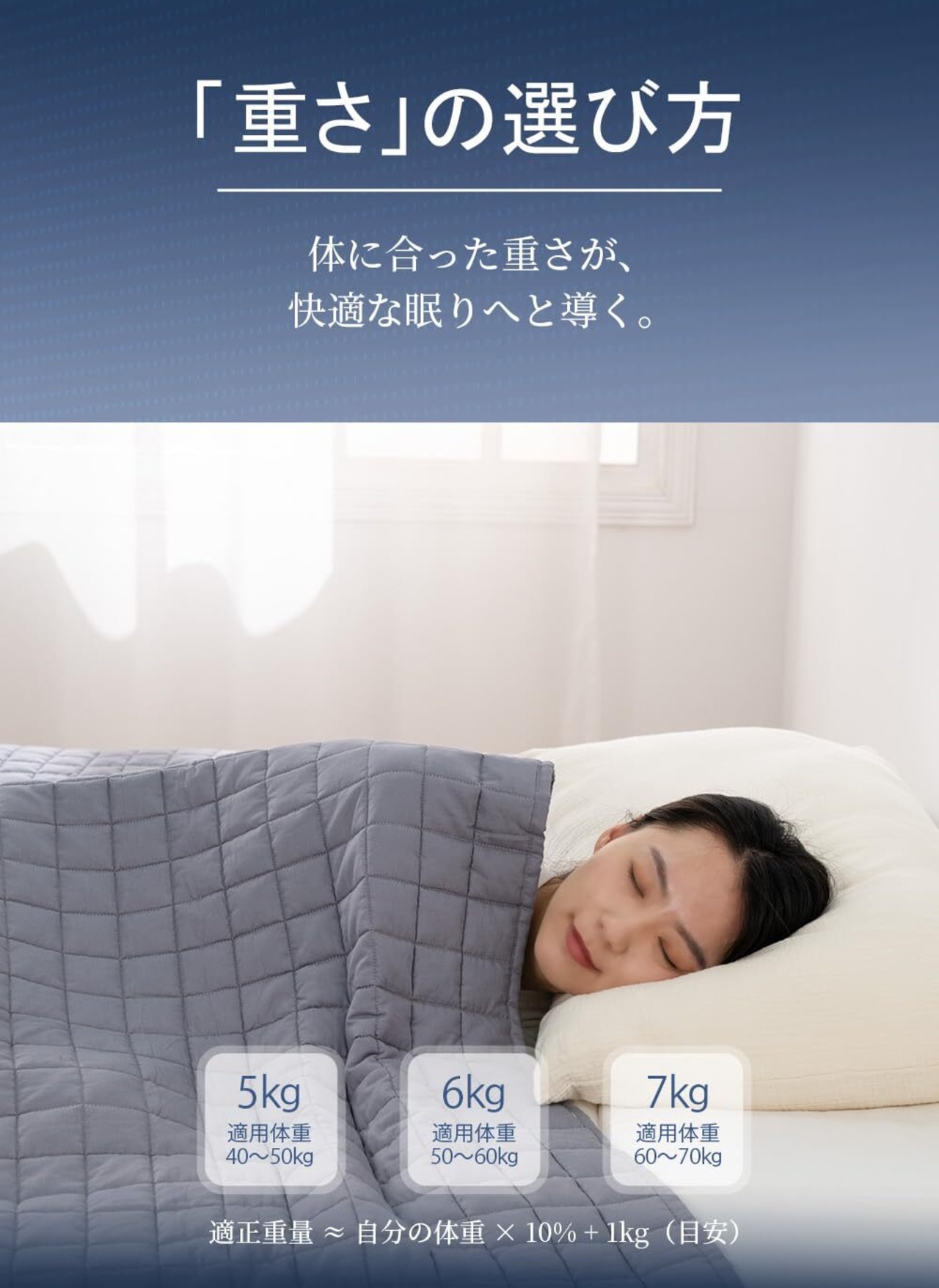 【体重に合わせて選べる重さ】40~50kgの方には5kg、50~60kgの方には6kg、60~70kgの方には7kgがおすすめです。体重に合った重さを選ぶことで、快適な使用感をお楽しみいただけます。