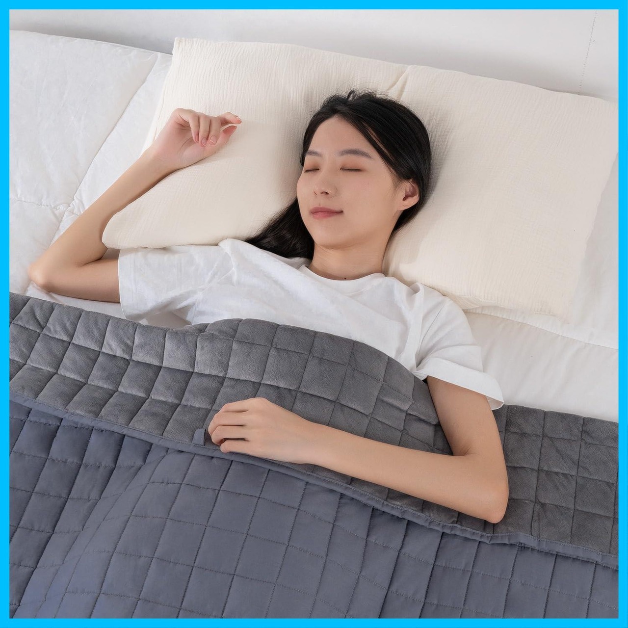 【両面素材で、季節ごとの快適さ】通常の重い布団や毛布とは異なり、両面に異なる素材を使用しています。A面は滑らかなベロア生地で、肌触りが柔らかく温かいので、寒い季節にぴったり。B面は通気性の良い100%コットン素材を採用し、蒸し暑い季節にも快適にお使いいただけます。これにより、1年を通して、どんな季節でも快適にご使用いただける加重ブランケットです。