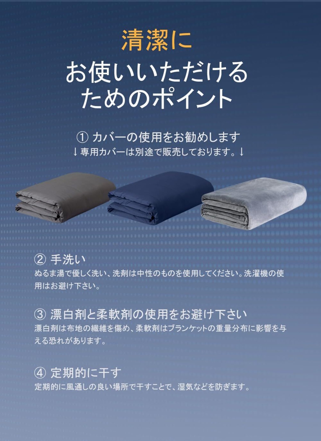 【清潔を保つために】ウェイトブランケットを清潔に保つために、ブランケットカバーの使用をおすすめします。カバーは別売りで、簡単に取り外して洗うことができます。これにより、ブランケットを長く清潔に保つことができ、快適に使用し続けられます。