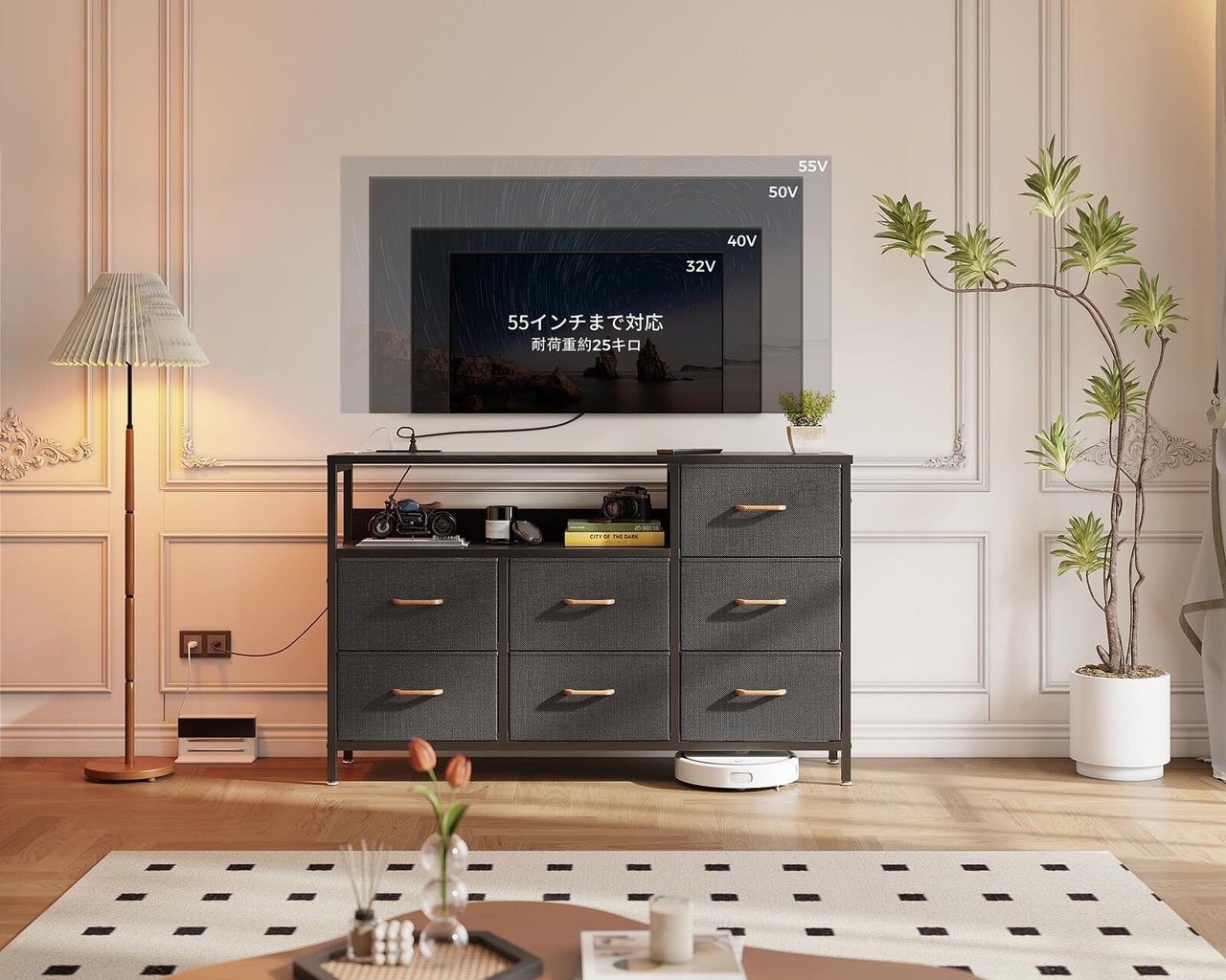 AODK タンス チェスト コンセント付き 幅132×奥行30×高さ90cm テレビ台 リビング 収納 大容量 洋服タンス 収納ケース 衣装ケース 布製引き出し 箪笥 おしゃれ 転倒防止 安定感 3段7杯 ダークグレー&ブラック