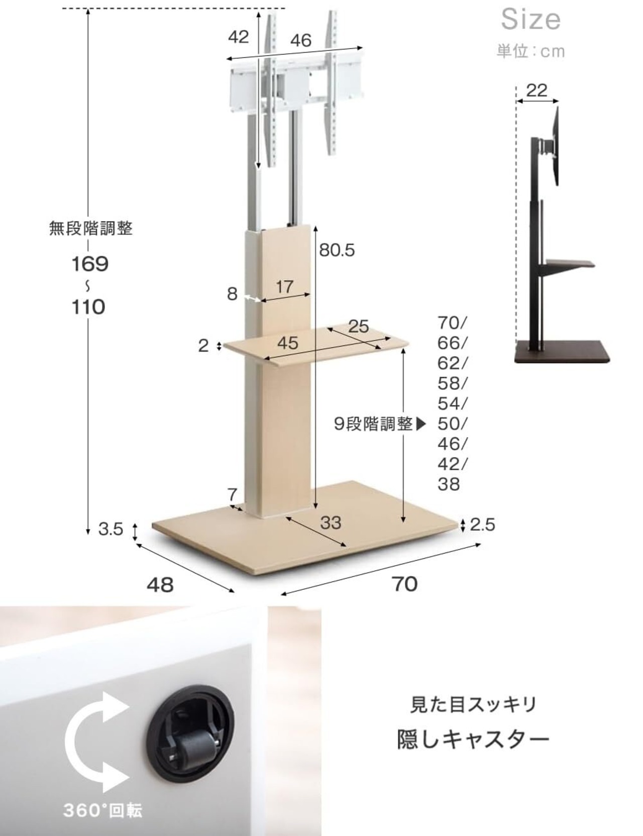 【サイズ】外寸:幅70×奥行48×高さ110~169cm 棚板:幅45×奥行25cm 【重量】約17kg【対応テレビサイズ】32~77インチ