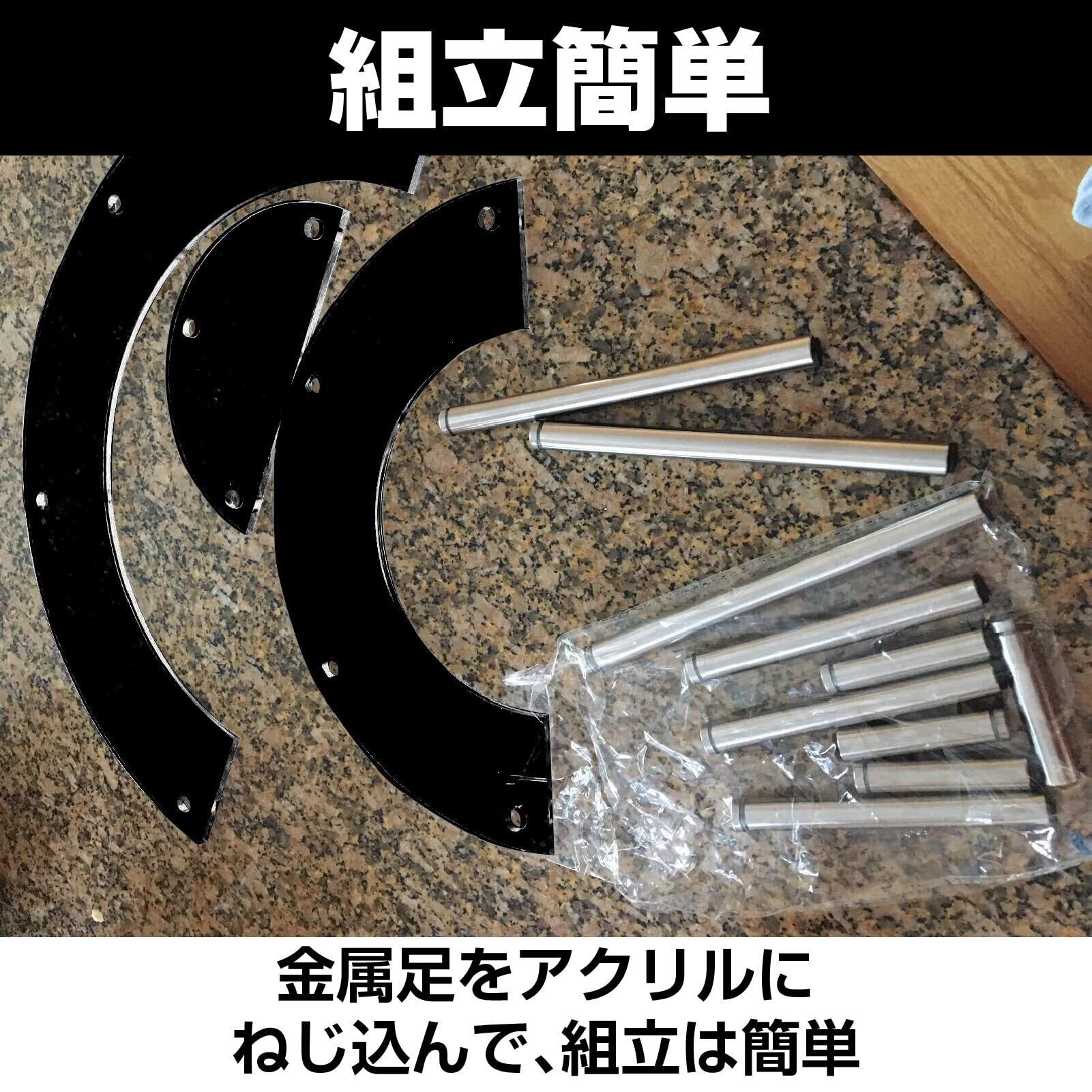 組み立て簡単。アクリルについた保護膜を外し、ビスを回して外しねじと脚を分けます。ねじを穴に入れてアクリルを重ねて脚を挟んで回して止めるだけ。ねじでアクリルを固定するので接着剤や工具は不要です。