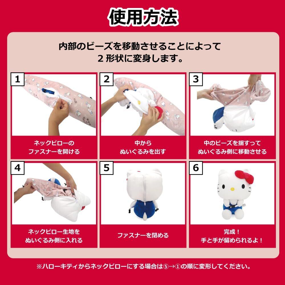 ハローキティ / 約H30×W25×D20(cm)約280g ネックピロー / 約H13×W66×D9.5(cm)※ベルトを外した長い状態(ベルト長さ含まず) 素材:ポリエステル、ポリウレタン マイクロビーズ/ ポリスチレン 製造国:中国
