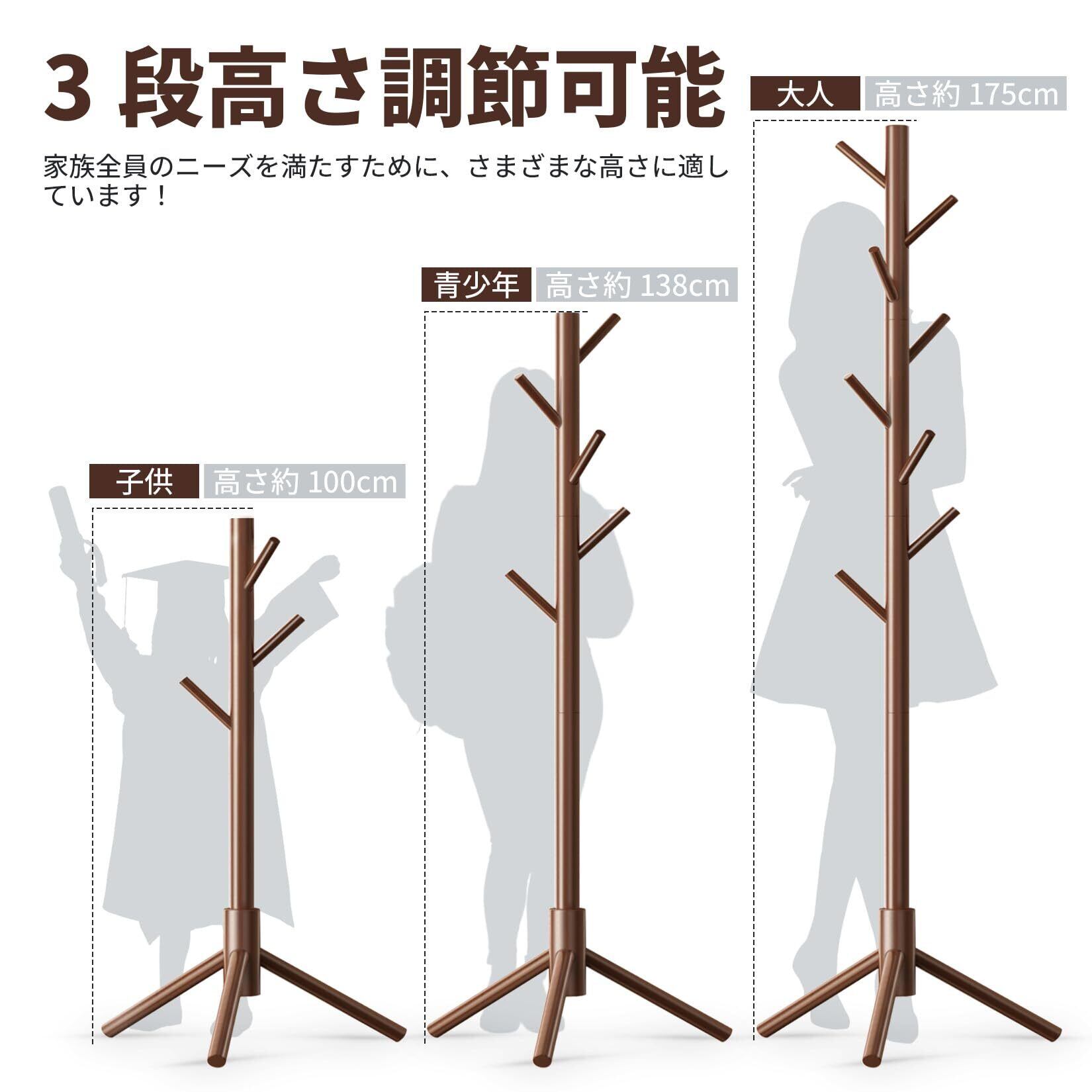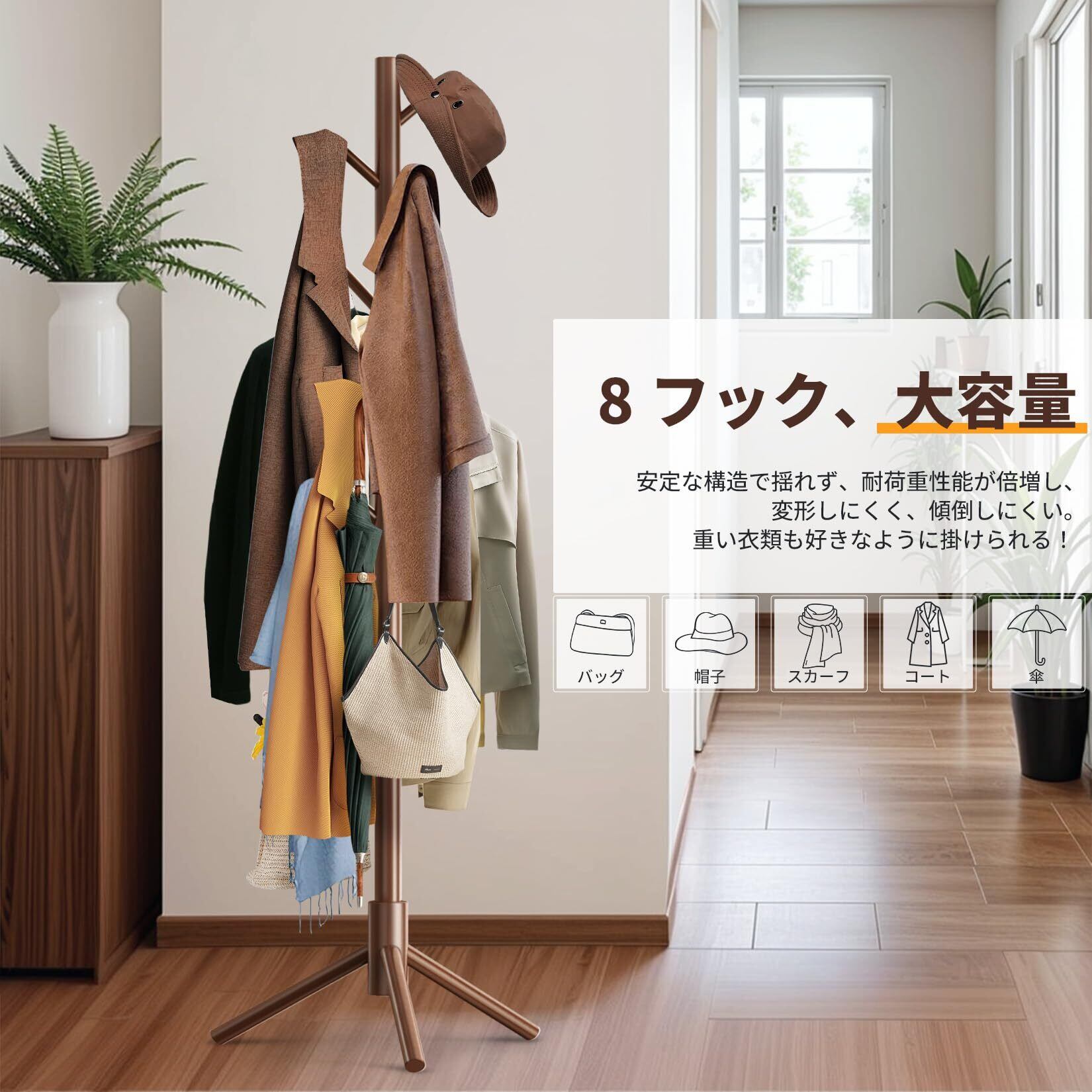 Avocahom ポールハンガー 木製 コートハンガー かばん掛け ポール 子供 ハンガースリム 洋服掛けポール おしゃれ 帽子掛けスタンド バッグ掛け 8つフック 衣類収納 玄関ハンガー 高さ調節可能 高い安定感 高さ175cm 組立て簡単 玄関 リビング 寝室 (ブラウン)