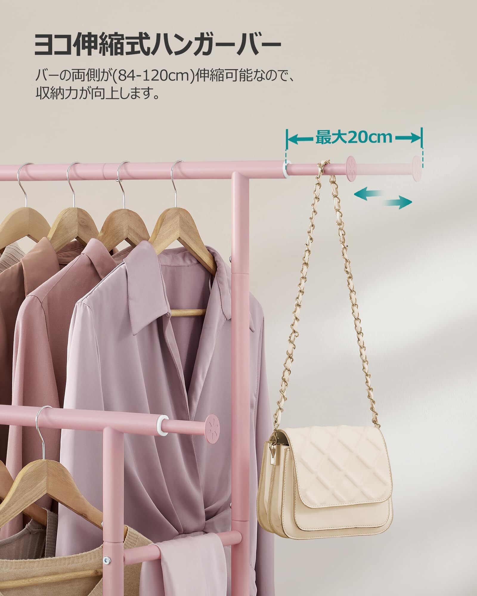 【驚きの収納力】前後2本の伸縮式ポールがあり、この衣装ラックの収納能力が大幅に向上しています。