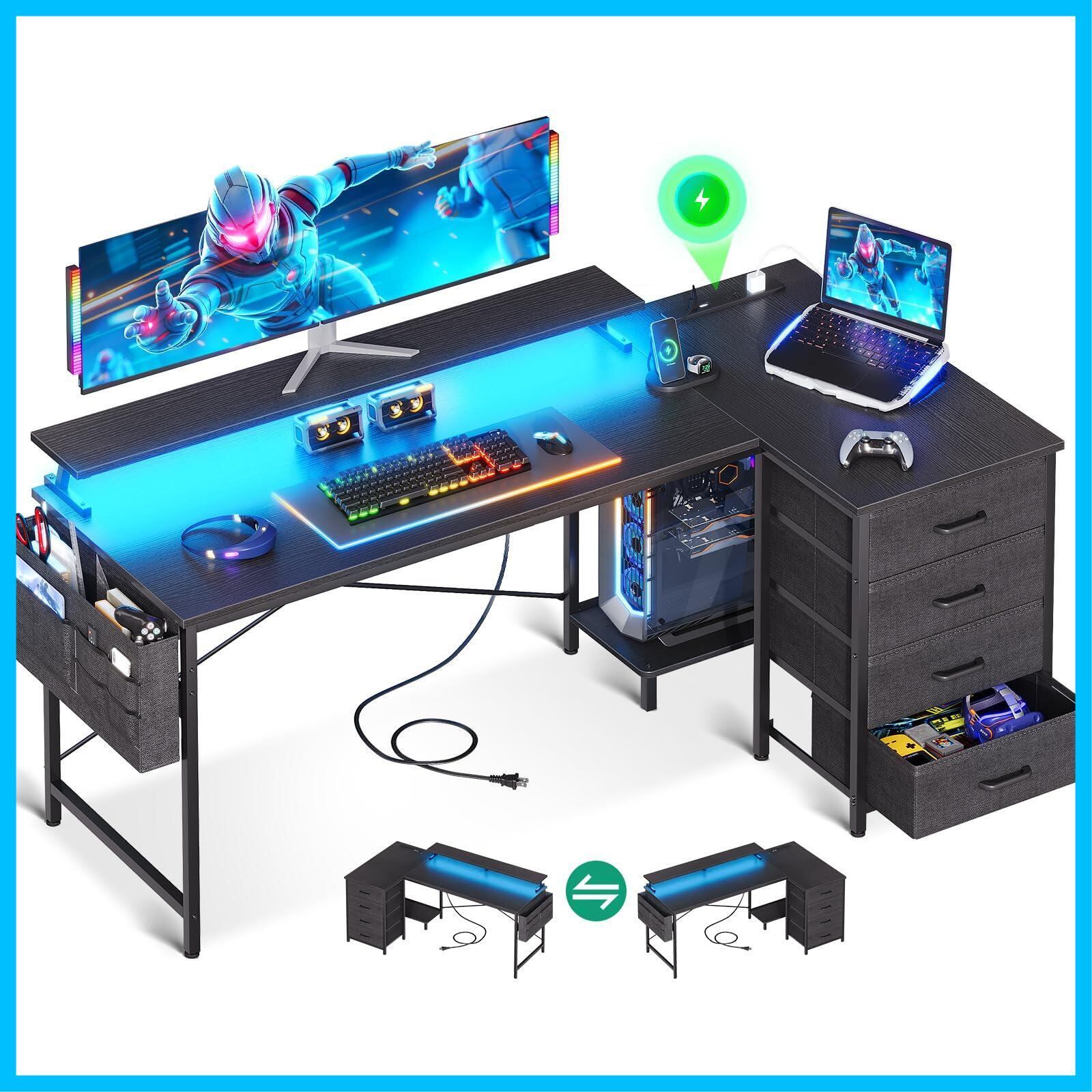 【在庫処分】AODK ゲーミングデスク パソコンデスク l字デスク 引き出し&コンセント付き 幅160×奥行80cm 机 pcデスク ゲームデスク LED付き gaming desk l shaped 在宅ワーク/オフィス用 左右入れ替え対応 ブラック