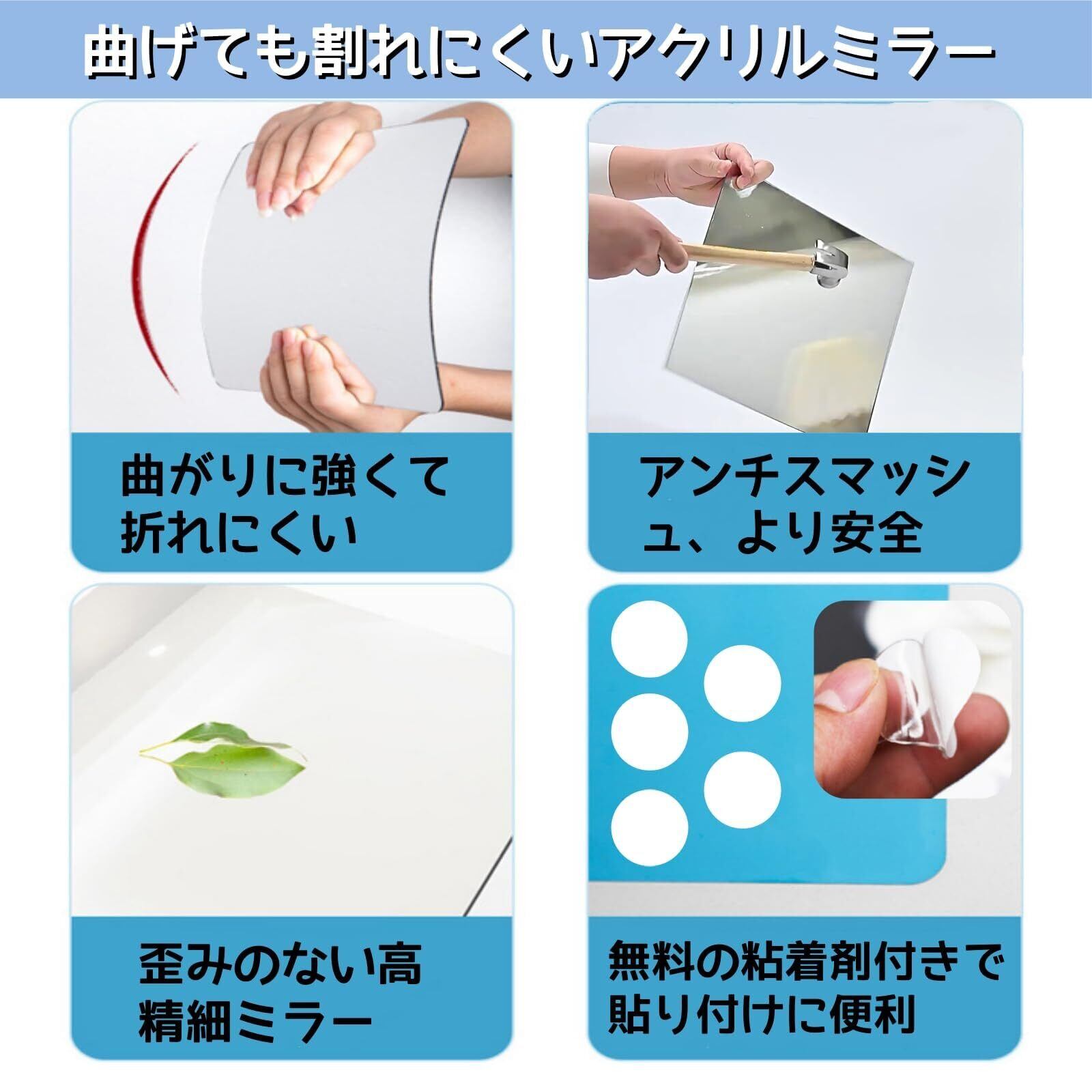 【強力な粘着力、剥がれにくい】各ミラーには5枚の丸型強力両面テープが装備されており、壁掛けミラーや浴室ミラーに安全に貼り付けることができ、丸型両面テープは跡を残さずに剥がすことができるという特徴があり、壁に悪い跡が残らないことをし、賃貸住宅の人にとって非常に便利です。割れないタイプのミラーなので、飛散防止の姿見やアクリルミラー、ミラーシールとして大変便利です。