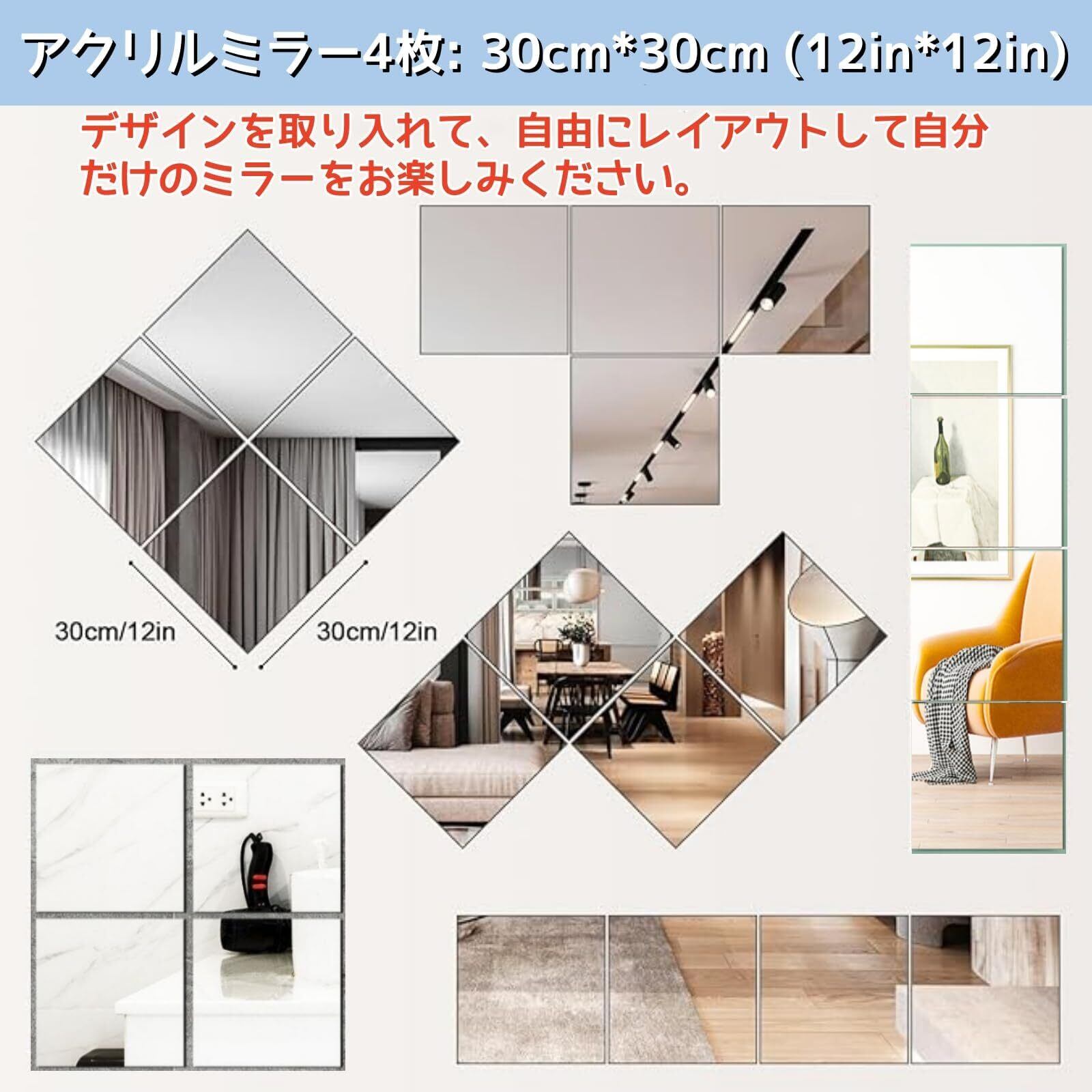 4枚割れない 軽量 ミラー アクリル 飛散防止 30*30cm 安全性 耐衝撃・飛散防止設計で、クローゼットや玄関にもぴったりDIY鏡壁に貼る鏡 全身鏡 姿見鏡 壁掛け 浴室
