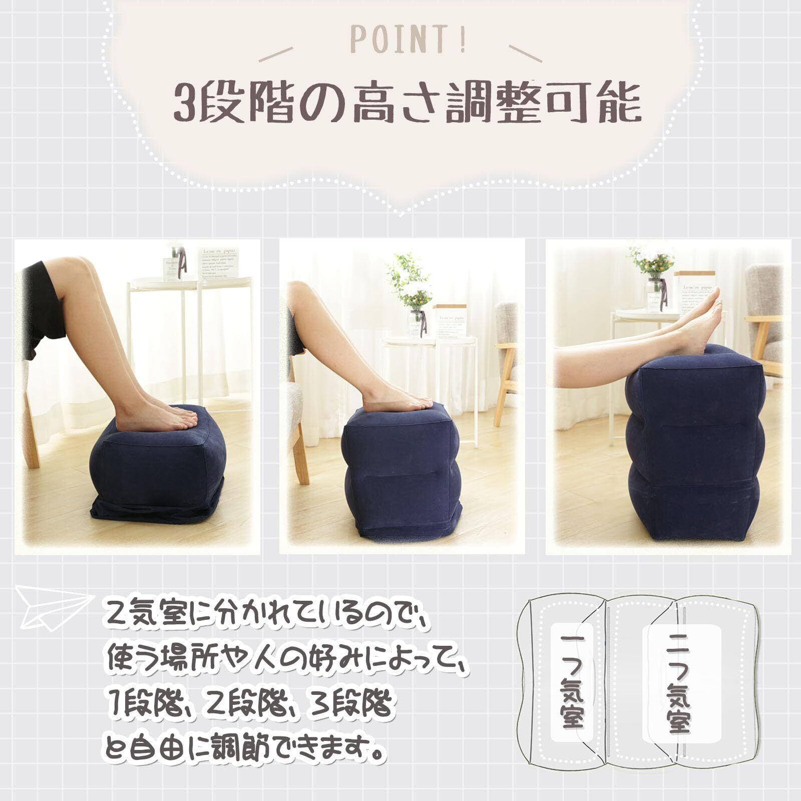 【3段階の高さ・様々なシーンで活躍】2気室に分かれているので、3段階の高さに調節が可能です。使う場所や人の好みによって1段階、2段階、3段階と自由に調節できます。家内、オフィス、新幹線、飛行機、車などに適用します。また、空港での飛行を待っている間、椅子として使用することもできます。