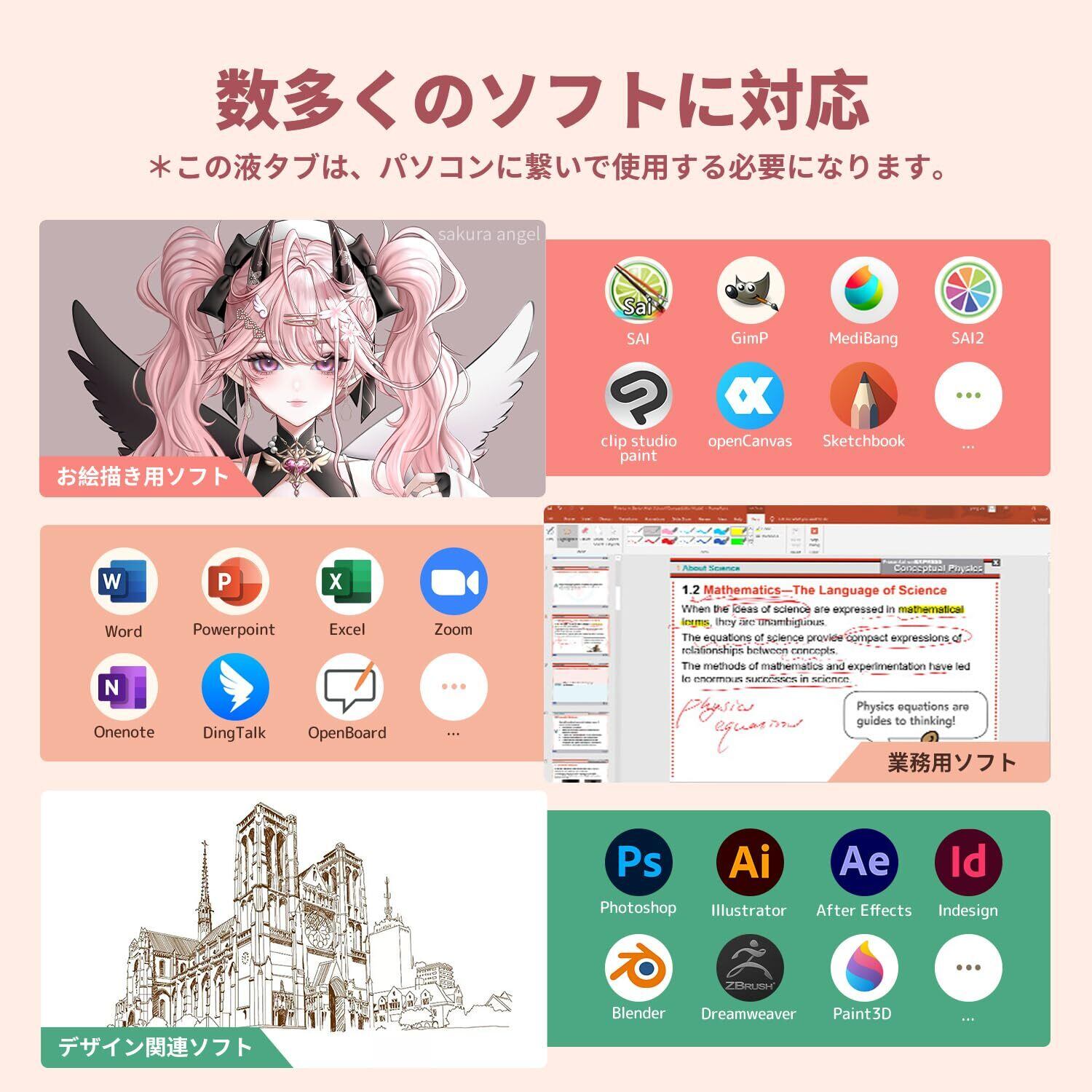 【筆圧8192レベル&充電不要ペン】--ペンは8192レベルの筆圧検知と±60レベル傾き検知に対応しており、自然で繊細な表現でイラストや絵を描くことができます。また、充電不要式なので、電池切れの心配はいりません。環境にもやさしいです。【ペンホルダー&8替芯】--液タブの替芯はペンホルダーに内蔵されています。