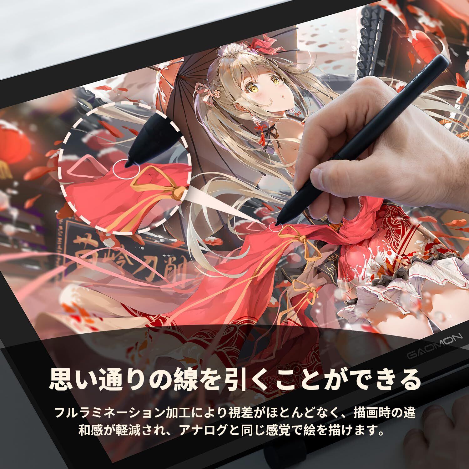 【IPSフルラミネーション加工& 92% NTSCの広色域】--フルラミネーション加工のおかげで、液タブのガラスによる視差を最小限にまで抑えることで、思い通りの線が描けます。フルHDの解像度(1920x1080)での表示が可能ですので、細かい描き込み作業やレタッチ作業にも適します。92% NTSCの広色域により、より自然で鮮やかな映像表示を実現します。