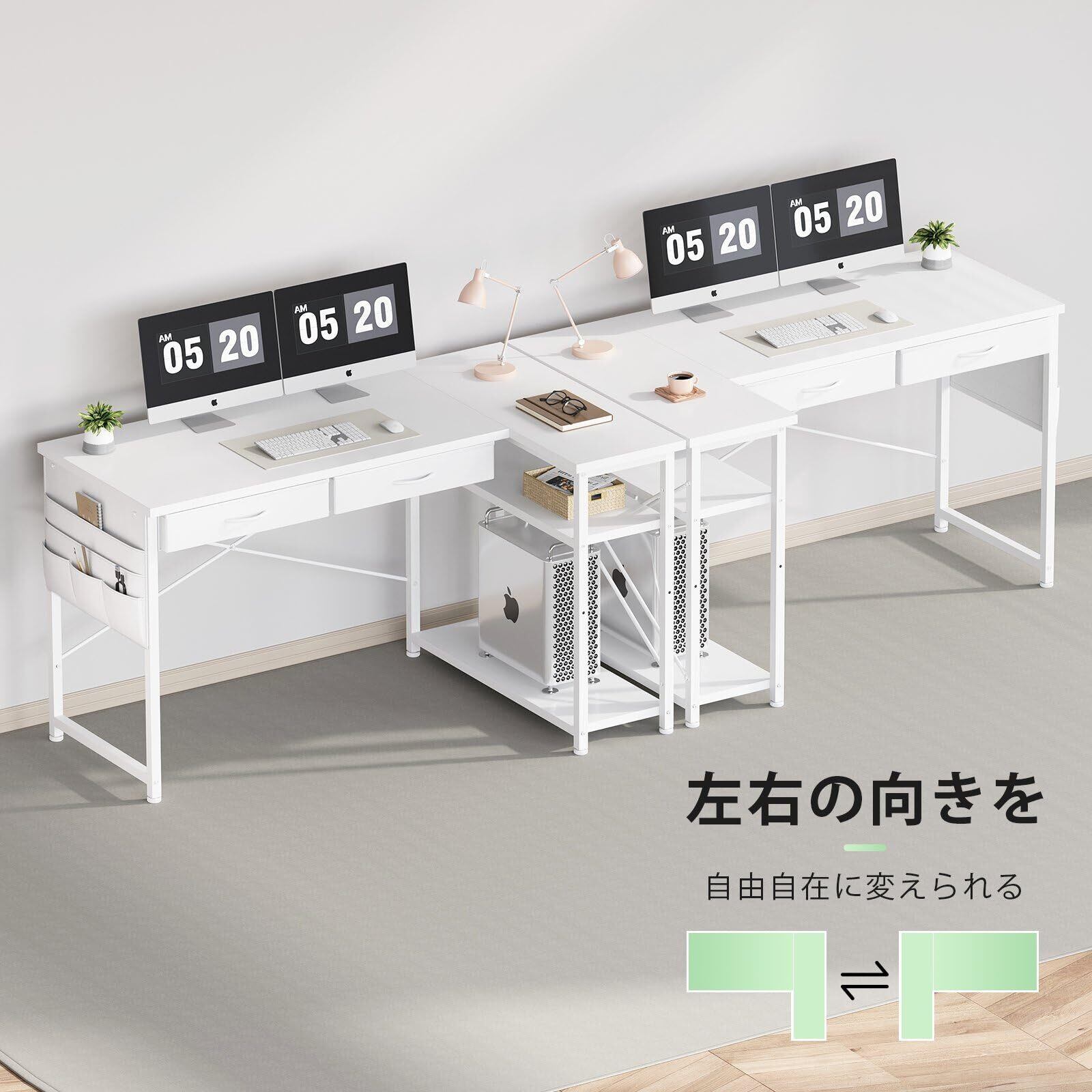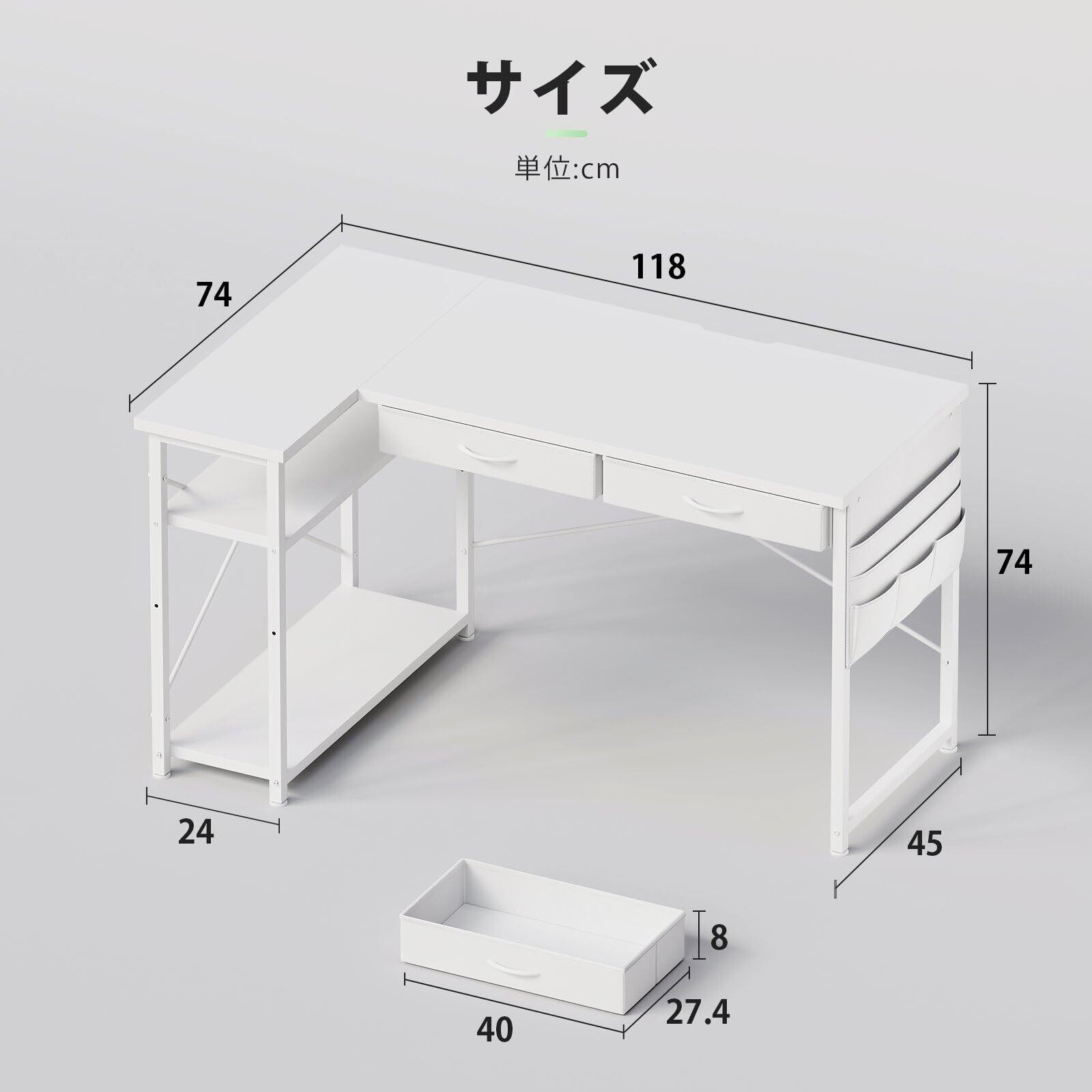 Maihail l字デスク机pcデスク ラック付き パソコンデスク 幅120cm×奥行50cm つくえ 勉強机学習机 左右入替可 布製引き出し付き オフィスデスク ワークデスク 収納ラック 白い