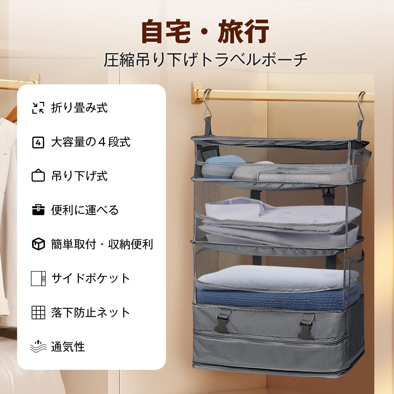 VARNIC 吊り下げ収納 トラベルポーチ 落下防止ネット付き クローゼット 旅行 出張 ポータブル 吊り下げ収納ケース 衣類ラック 収納 大容量 4段 省スペース 折り畳み式 取付簡単 トラベル 吊り下げ 通気性 防臭 (グレー, X-Large)