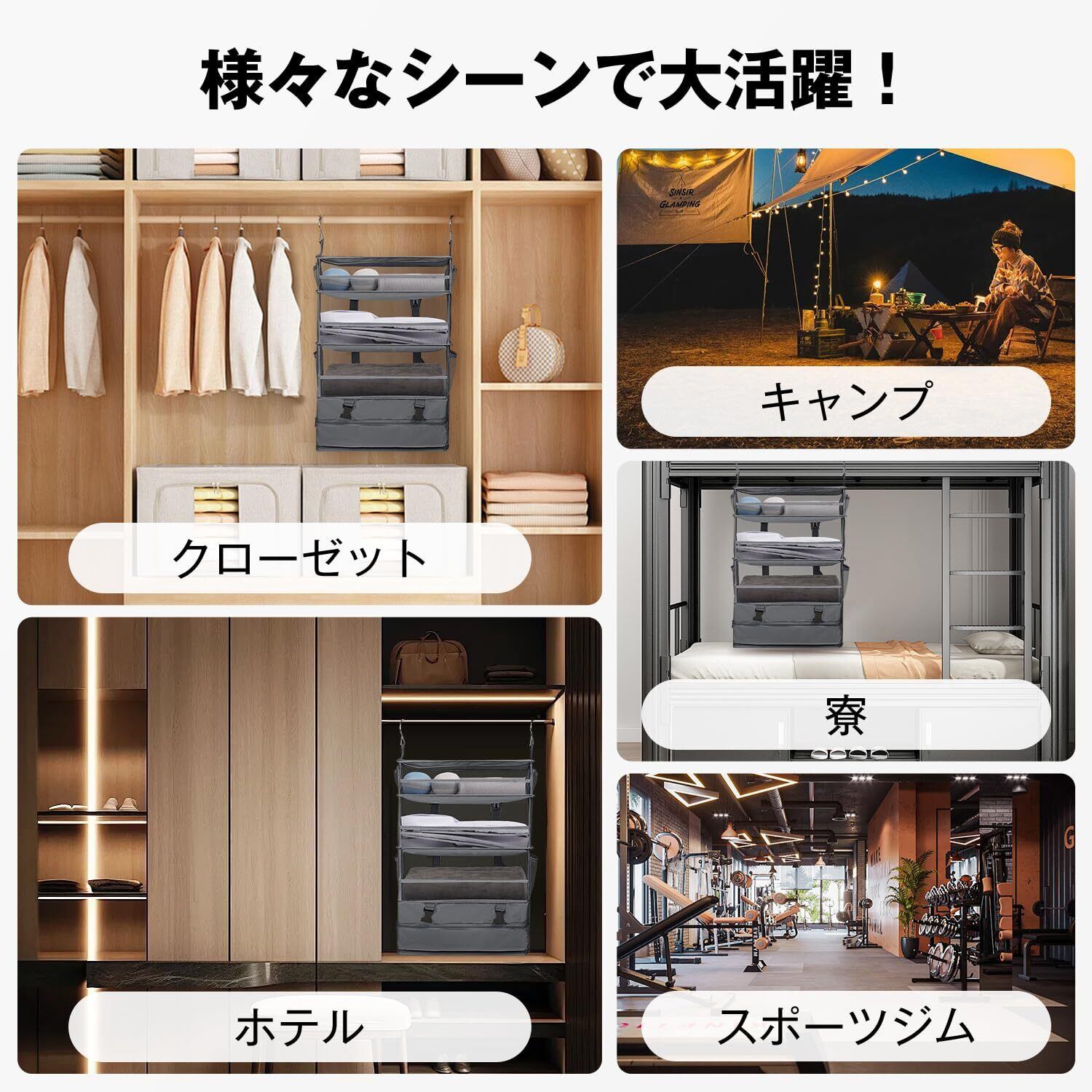 【斬新なデザイン】大容量の4段式で、より多くの物を収納可能です。上の3段で未着用の衣類を収納でき、ファスナー収納層で着用済みの衣類や靴を収納できます。サイドポケットが4つあり、様々な小物を収納できます。また、衣類の落下を防止するために、各層に落下防止ネットが付いております。