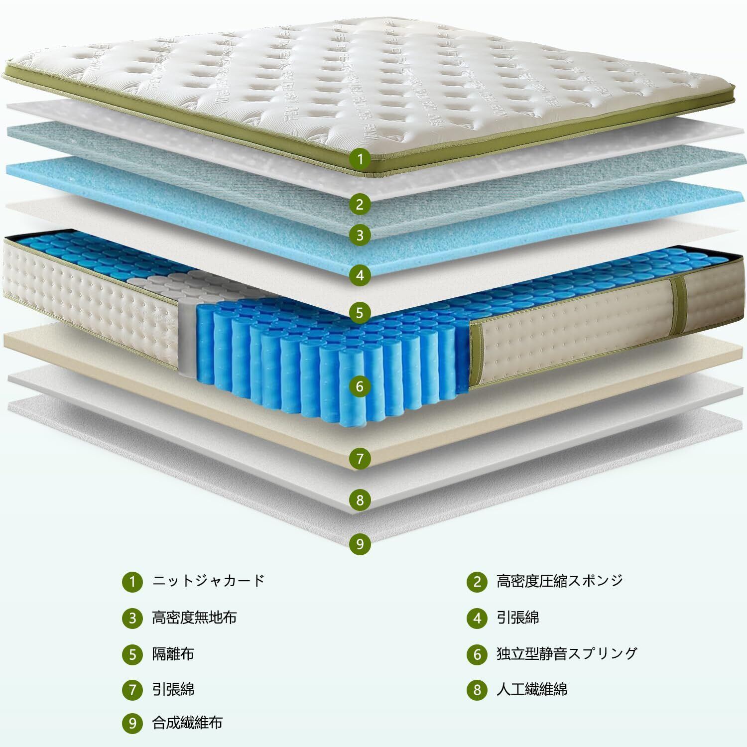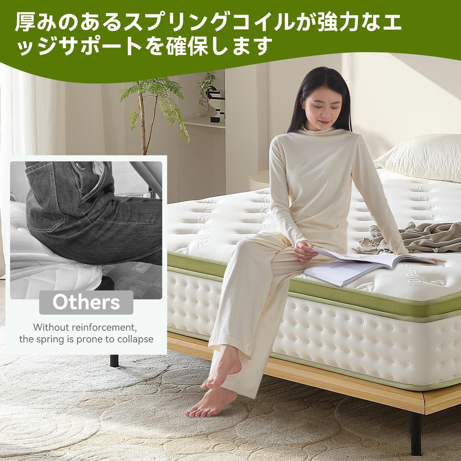 【高反発力の独立袋入りスプリング】:寝具を選ぶ際、マットレスのサポート力が不十分だと、腰痛や肩こりなど身体の不調を引き起こす原因になります。このマットレスは、さまざまな体重層に合わせた硬さ調整が施され、身体のS字ラインにフィットして圧力を分散します。適度な柔らかさと高反発マットレスの特性が、寝返りを打ちやすくし、圧力を均等に分散。さらに、ポケットコイルマットレスは、隣で寝ている人の動きが気になる方に最適で、寝ている間も安定したサポートを提供します。快適な睡眠を一晩中サポートし、朝までぐっすり眠れます。