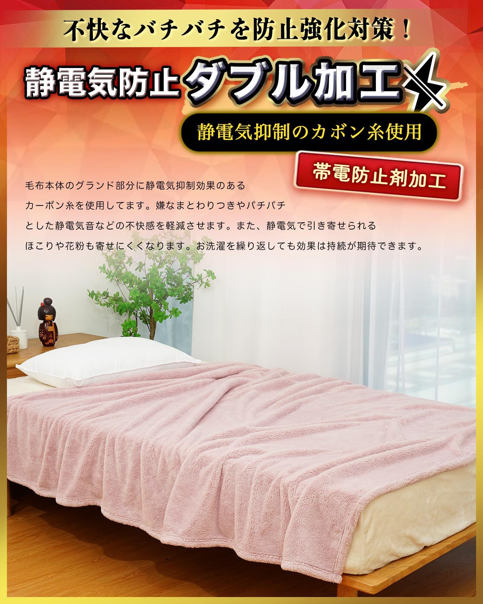 【99%静電気抑制】乾燥する季節は静電気を引き寄せ溜めこんでしまいやすく、冬に使用するマイクロファイバー 毛布が、パチパチッと静電気が走るのは困ったものです。この問題を解決するために、本社の冬用毛布では静電気抑制効果のあるカーボン糸の使用と、加工処理に静電剤を導入する二重の抑制方法を実施したとのことです。これにより、静電気を大幅に抑制できるため、まとわりつきや不快な音の軽減が期待できます。また、静電気で引き寄せられるほこりや花粉の付着も軽減されるそうです。お洗濯を繰り返しても、その効果は持続するとのことです。