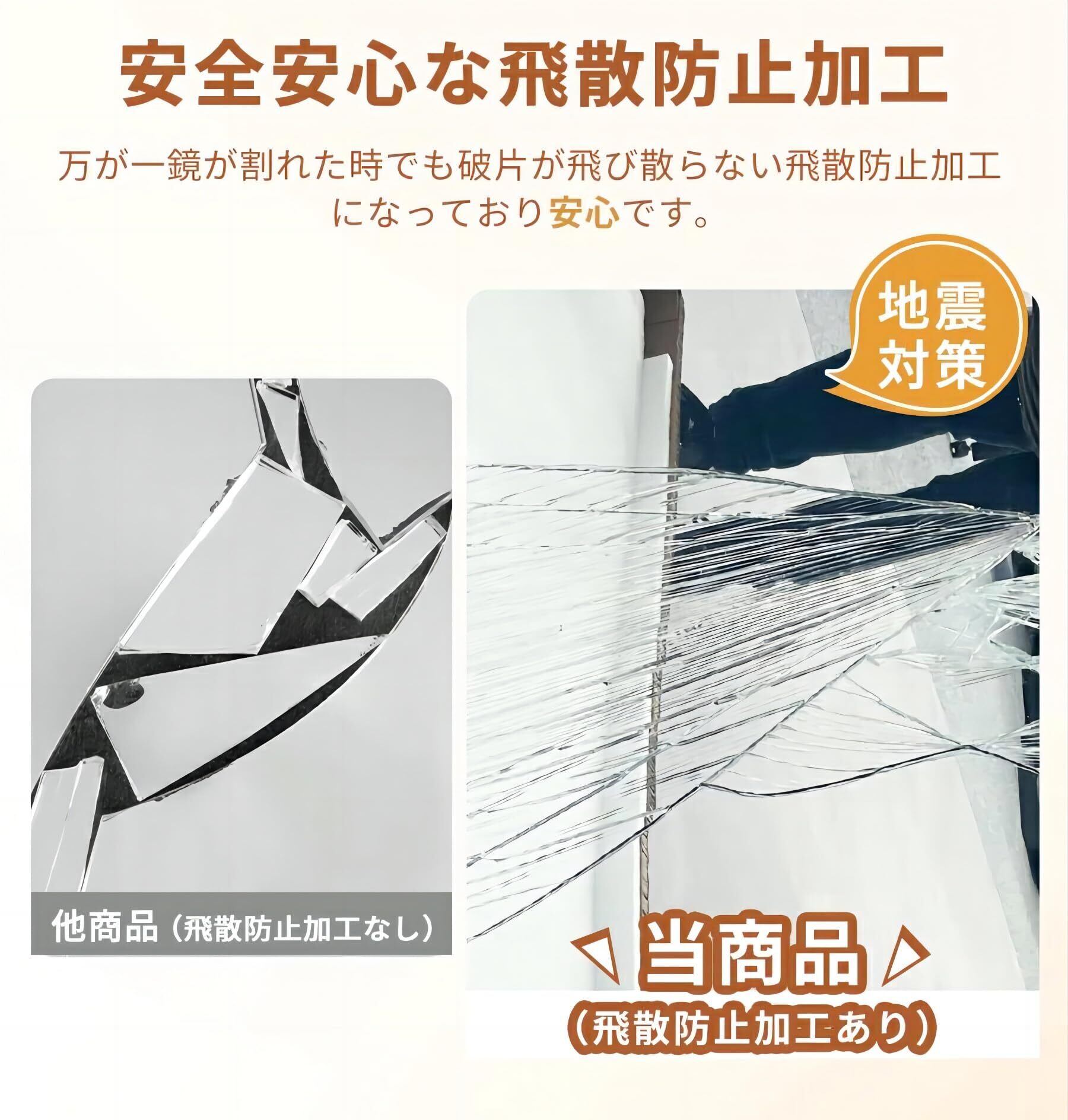 【飛散防止加工で安心設計】万が一、鏡が割れても飛散防止加工が施されているため、破片が飛び散らず安全です。お子様のいる家庭や公共の場でも安心してお使いいただけます。
