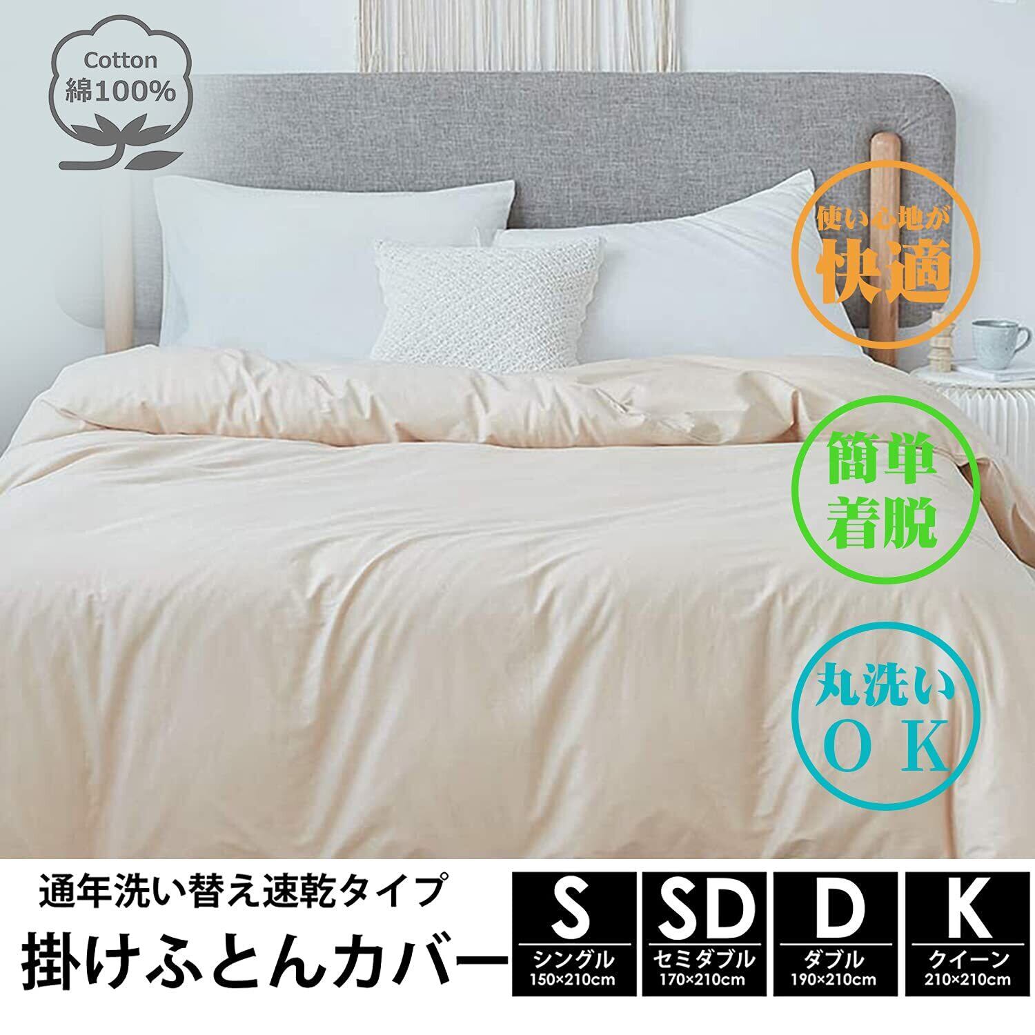 掛け布団カバー 布団カバー 綿100% ふとんカバー 掛けカバー 洗える 抗菌防臭 防ダニ オールシーズン ピーチスキン加工 全開ファスナー 通気 速乾 単品 (通年タイプ・アイボリー, シングル・150X210cm)