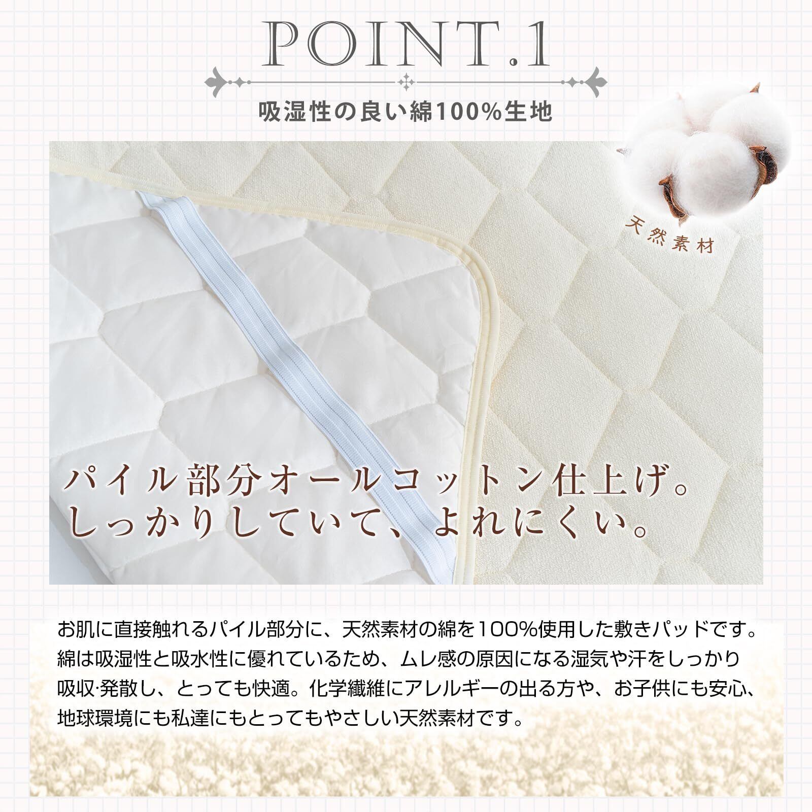 【吸湿性抜群の綿100%パイル】サイズ:シングル・100x200cm;表側パイル部分:綿100%;表側グランド部分:ポリエステル100%;中綿:ポリエステル・抗菌防臭帝人(TEIJIN)綿含み。仕様:四隅ゴムバンド付き。敷きパッドのお肌に直接触れるパイル部分に吸湿性抜群の天然素材の綿100%を使用し、湿気や汗を吸収でき、寝心地快適、春・夏・秋・冬を通してお使いいただけます。