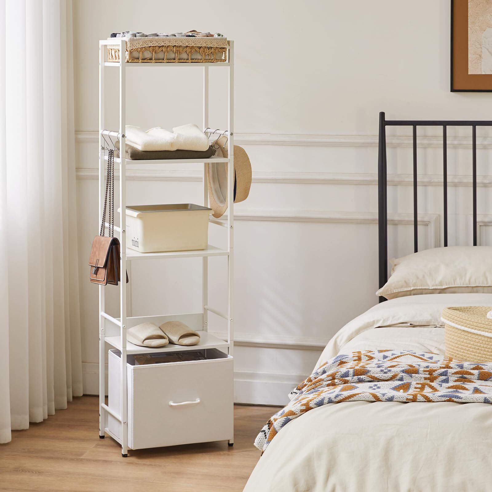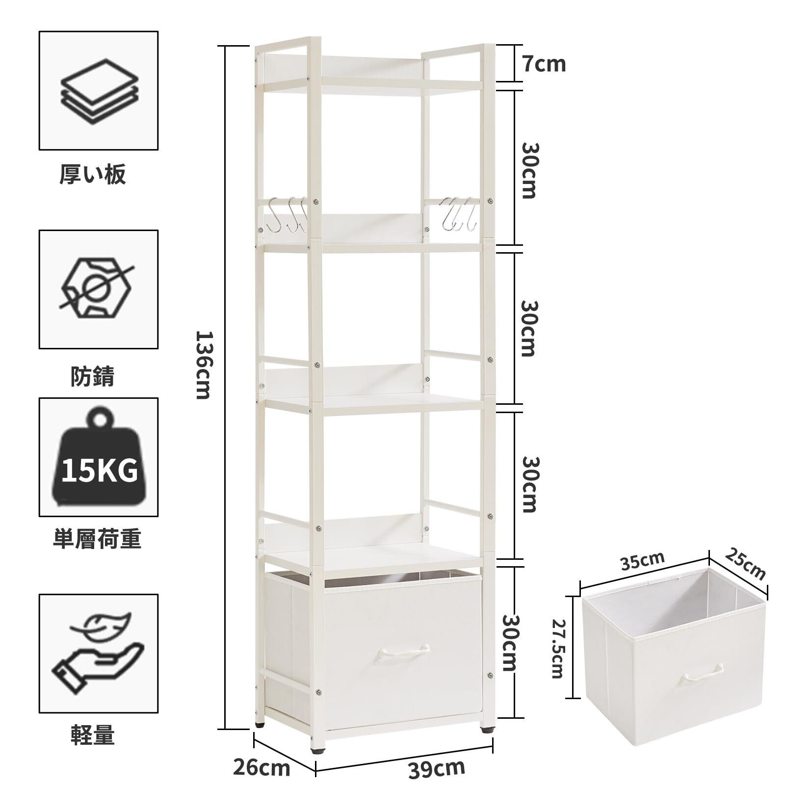 使いやすい:この棚ラックは取り付けやすく、分解も容易で、軽量で、移動や引っ越しに便利です。布の引き出しが1つ付いていて、物を分類して収納しやすく、部屋を清潔に保つことができます。また、6つのフックが付属しており、かばん、イヤホン、鍵、皮むき器と栓抜きなどの小物を収納できます