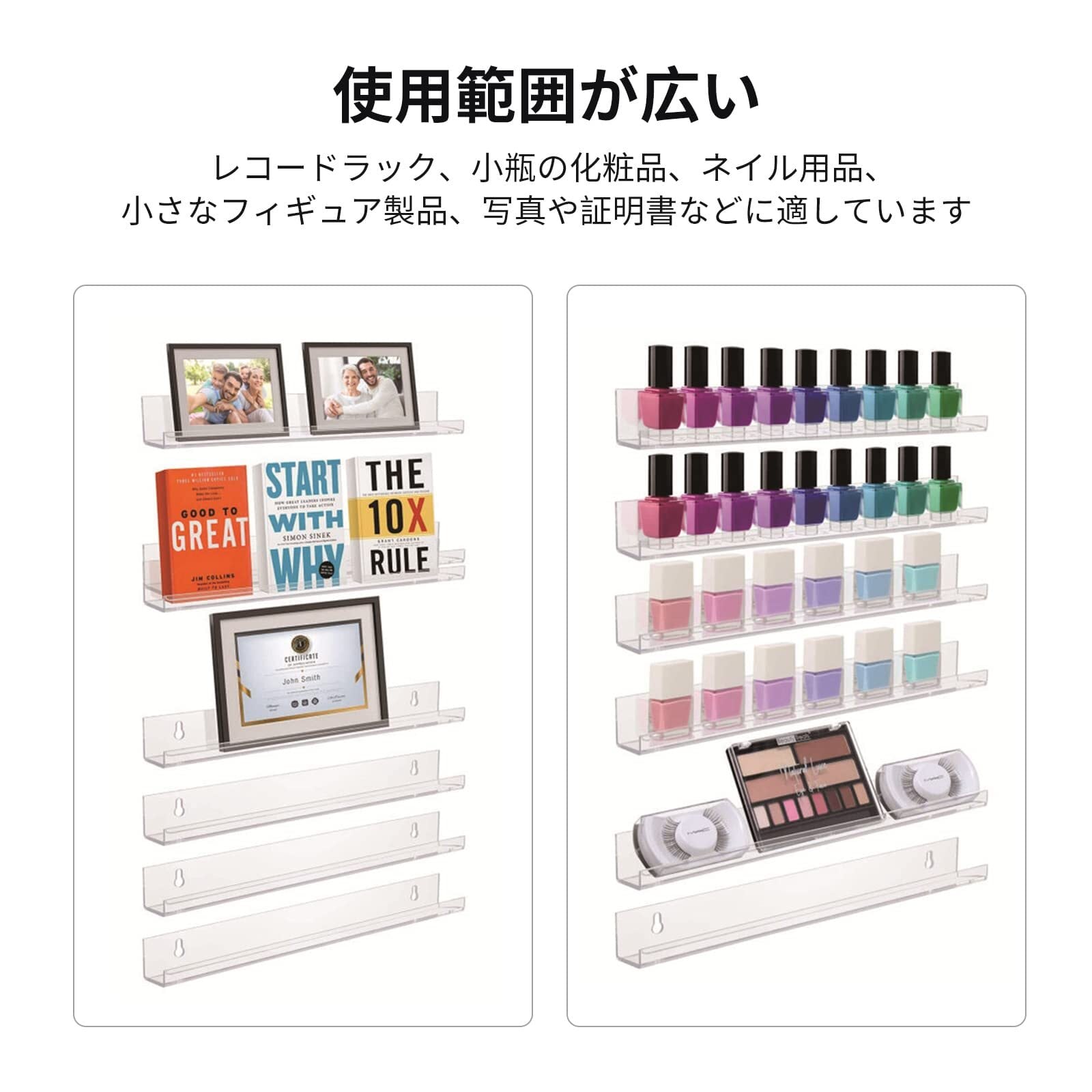 【取り付け簡単】耐久性あるステンレス製ネジ付き、簡単に固定できます。シンプルなデザインでどんな部屋の雰囲気にも合わせやすいです。壁に付けられる透明棚は、居間、ダイニングルーム、キッチン、寝室、書斎に設置でき、陳列台として、レコードラック、小瓶の化粧品、ネイル用品、小さなフィギュア製品、写真や証明書などに適しています。