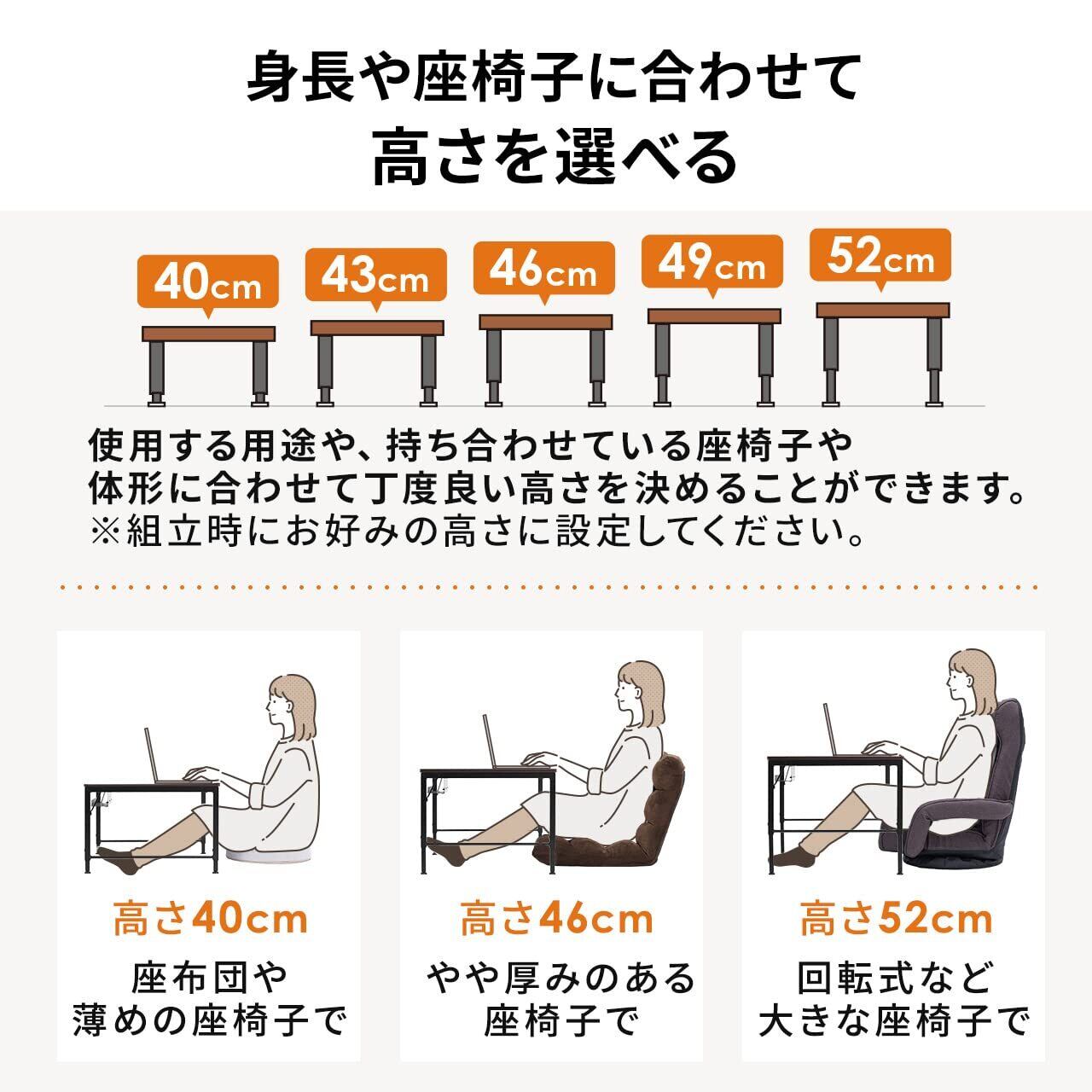 高さ調整は約40cm、約43cm、約46cm、約49cm、約52cmの5段階で調整できます。