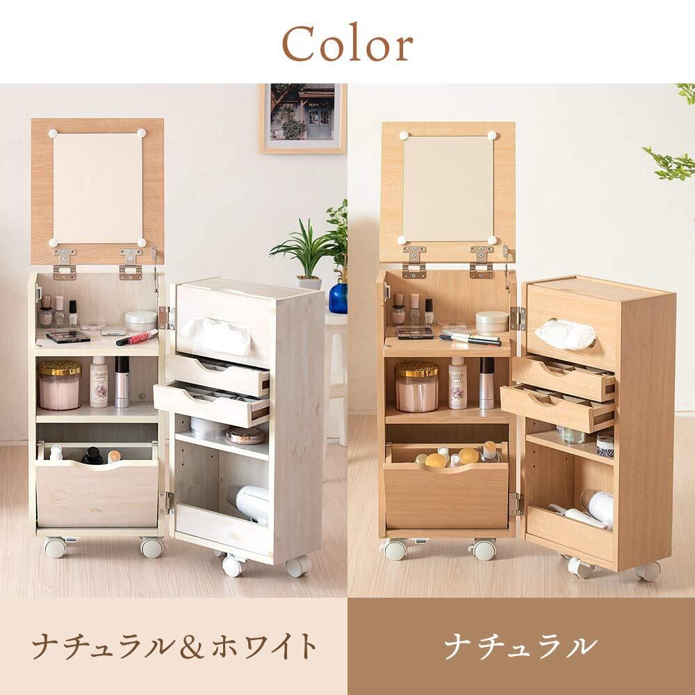 収納スペースが多く、コスメ・アクセサリー・美容家電などをたっぷり収納、さらに顔がしっかりみえる大型ミラー付き。