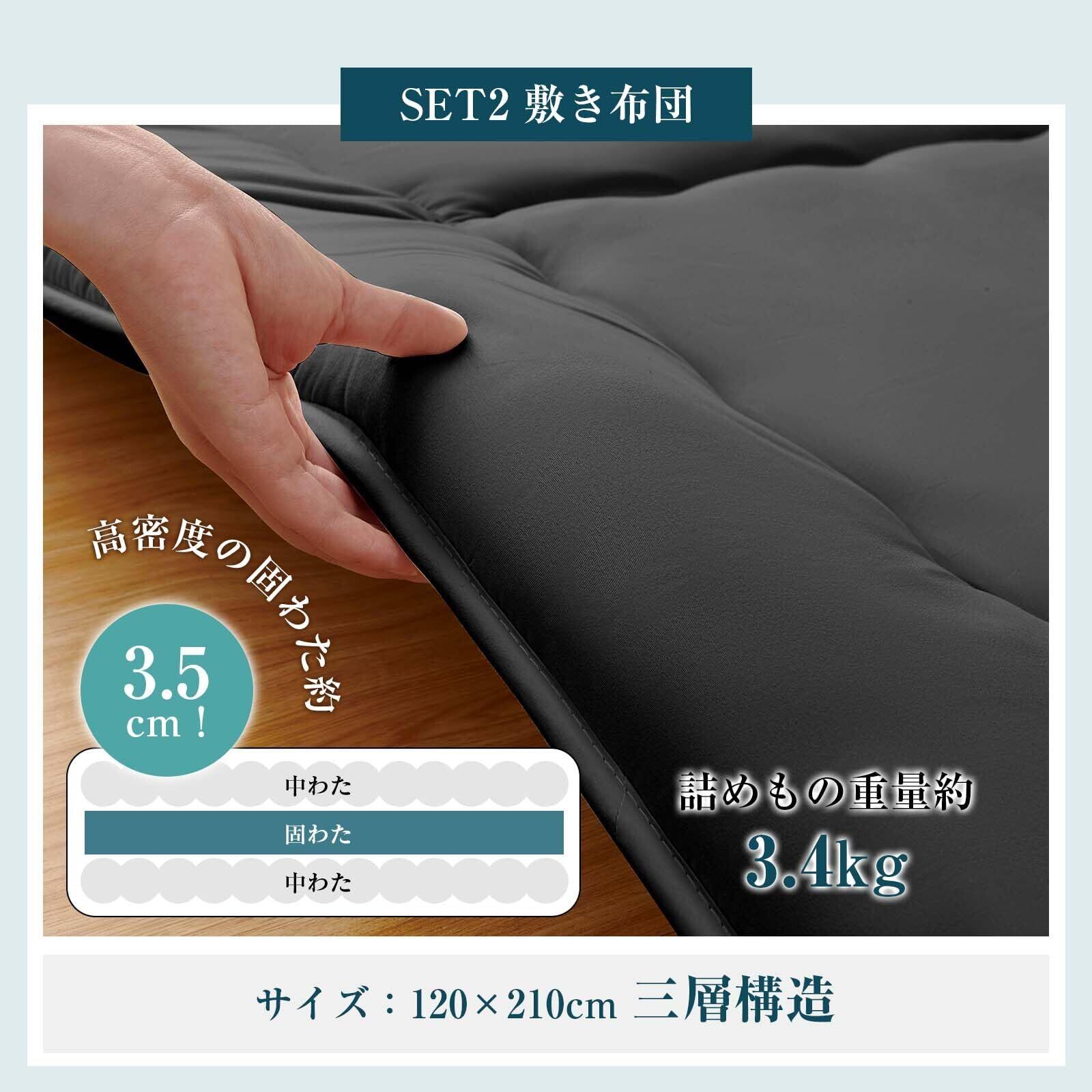 【敷き布団】サイズ:幅120×長さ210cm 側生地:ポリエステル100%(ピーチスキン加工・抗菌防臭加工) 巻き綿:ポリエステル100% 固綿:ポリエステル100%(厚さ約3.5cm) 詰め物重量:約3.4kg 寝心地を左右する敷布団の中材には体圧分散性に優れた高密度固綿を使用、ふんわりやわらかな寝心地ながらもしっかりとサポート、寝返りもうちやすく、身体が沈み込みすぎることなくサポート性と寝心地のバランスが取れた敷布団です。