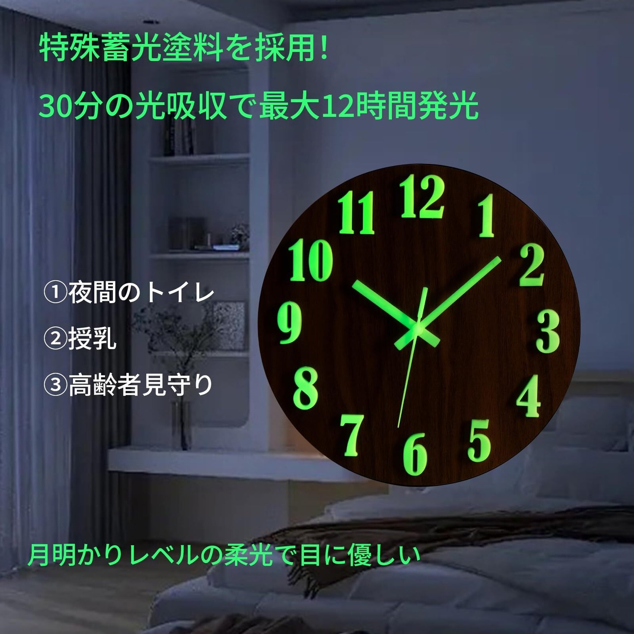 【暗闇で光る「常時蓄光文字盤」】:特殊蓄光塗料を採用します。30分の光吸収で最大12時間発光しています。 夜間のトイレ/授乳/高齢者見守りに最適です。月明かりレベルの柔光で目に優しい。