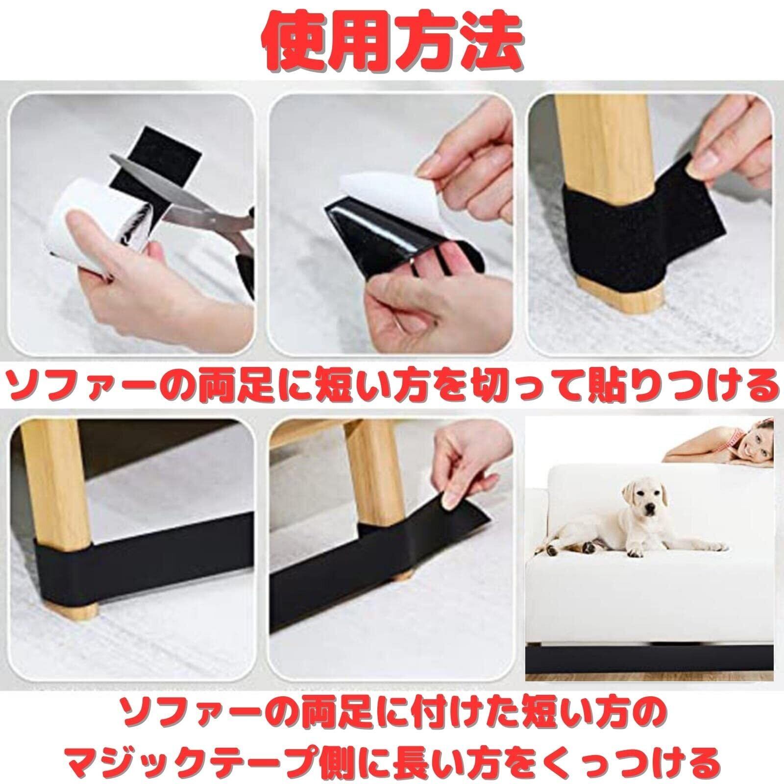 【簡単設置】ソファーの両足に粘着テープ(マジックテープ付き)を切って貼り付ける。ソファーの両足に付けたマジックテープに隙間テープ(マジックテープ付き)をくっつける。