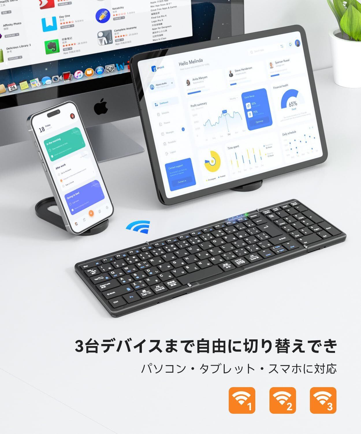 【3システム対応&3台設備まで切替使用】折り畳み ブルートゥース キーボードはiOS、Windows、Macなど三つシステムに適用しております。また、3台マルチペアリングに対応し、タブレット、パソコン キーボード、スマホの間、ボタンワンクリックで利用したい機器と接続可能です。