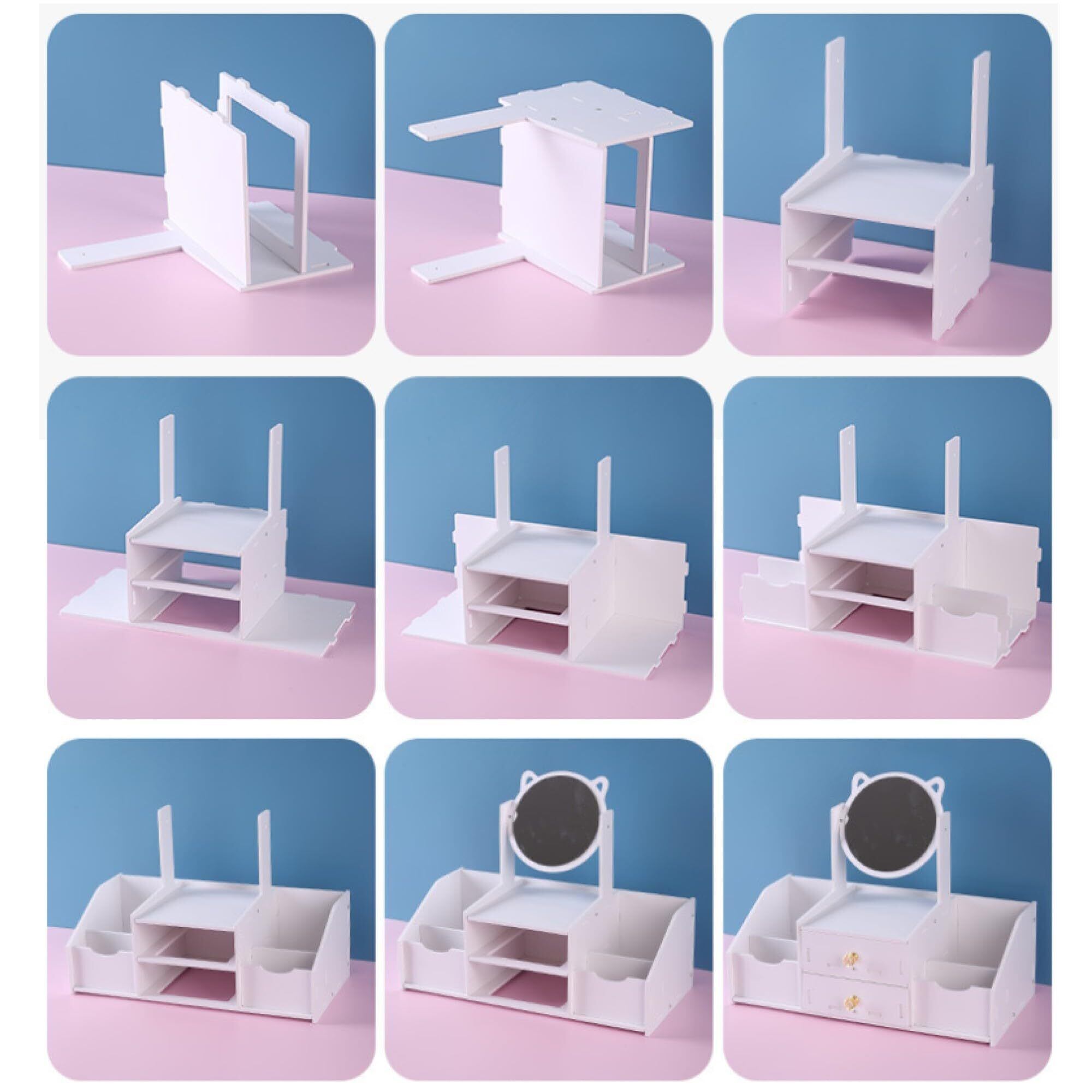 【ミニサイズの可愛いドレッサー】化粧道具や小物入れに使える可愛いミニドレッサーです。シンプルなホワイトカラーで、猫耳や四角デザインのミラーで化粧をお楽しみいただけます。