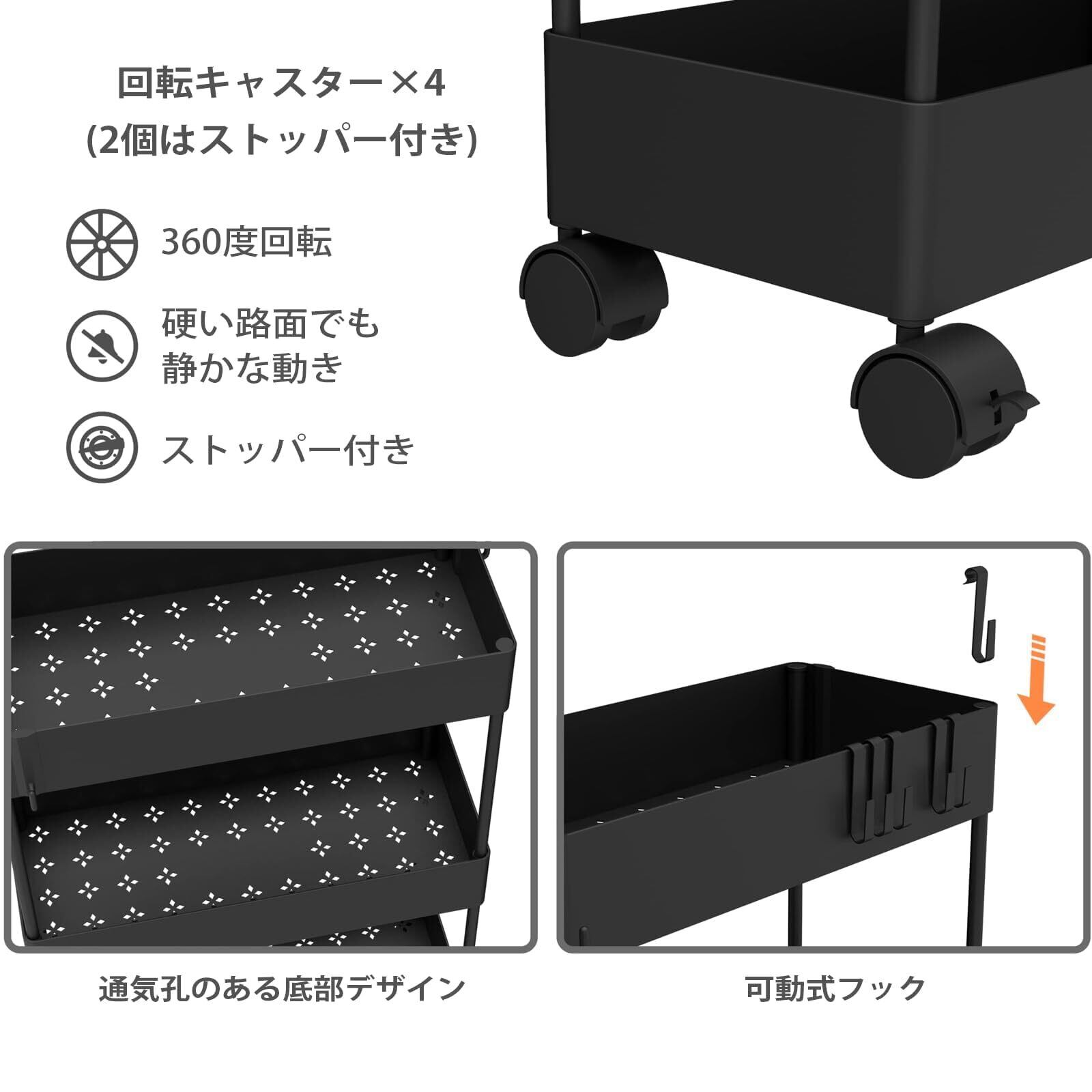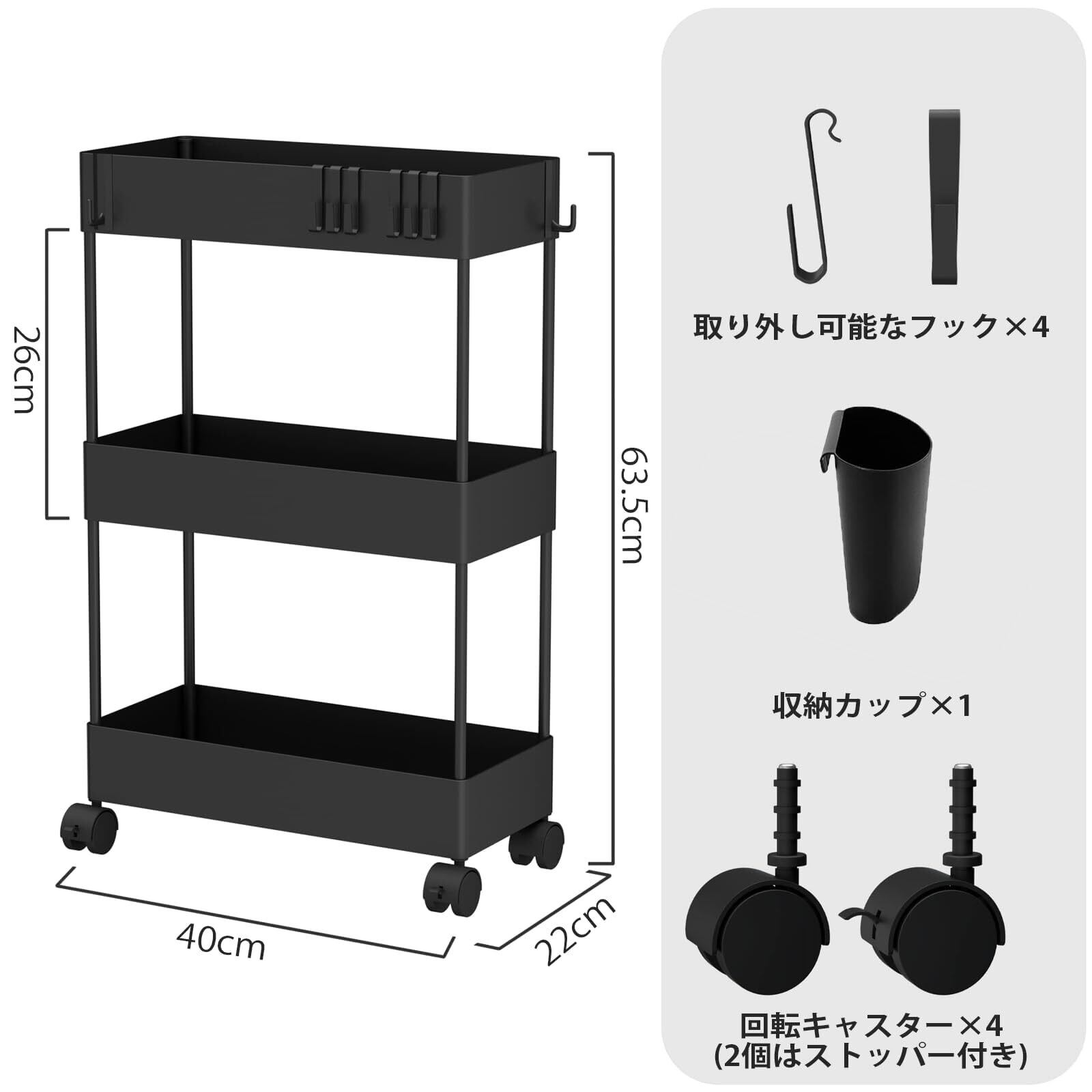 【在庫処分】SIUSA キッチンワゴン キャスター付き ワゴン 隙間収納 スリム 収納カート キッチン 洗面所 収納 13.5cm 18cm 22cm 冷蔵庫横 台所 浴室 トイレ 細い棚 3段 4段 おしゃれ 組立簡単 フック&収納カップ付き (3段式-[22cm]-ブラック)