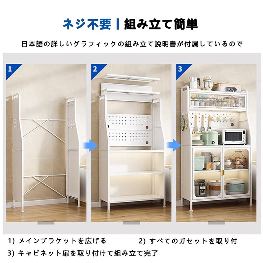 【仕切り収納】:食器棚 ひとり暮らし用、区分けで沢山収納でき、下部には2層、大型置物エリア、調節可能なバックルデザイン、中央のパーティション丨5段階の調節、5cm間隔、自由に分解でき、大型家電の収納に十分対応します。食器棚 レンジ台付き、高さ83cm、操作中にかがむ必要がなく、操作が簡単で快適。穴掛け板丨收纳、フックや小さなキャビネットボックスを掛けて、小さなアイテムを置くことができます。上段展示エリア、毎日使用頻度の低いアイテムを配置できます、限られたスペースを節約するために。キッチン、リビング、書房、寝室など様々な場所で使用でき、収納力にも優れています。