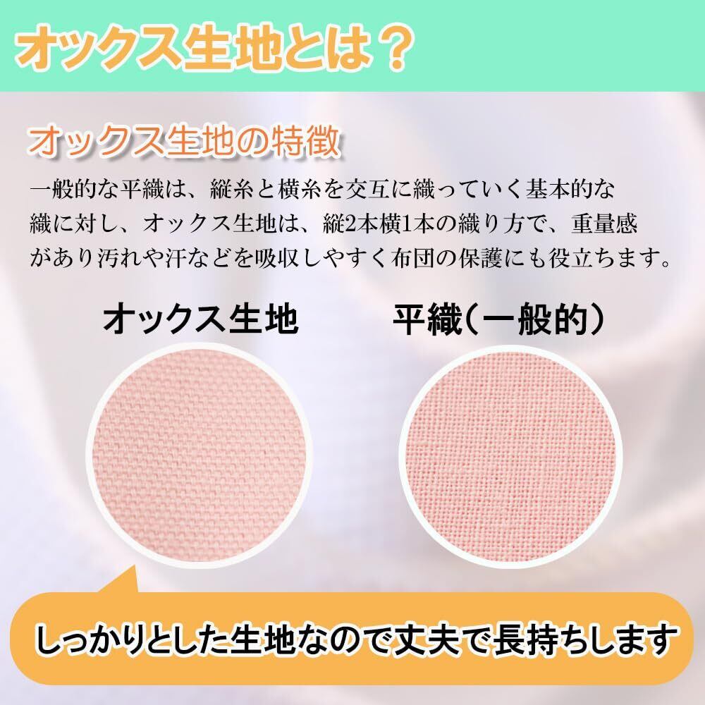 【オックス生地特有のしっかりとした厚地生地】一般的な平織りは、縦糸と横糸を交互に織っていく基本的な織りに対し、オックス生地は縦2本横1本の織り方で、重量感があり汚れや汗などを吸収しやすく布団の保護にも役立ちます。しっかりとした生地なので丈夫で長持ちします。