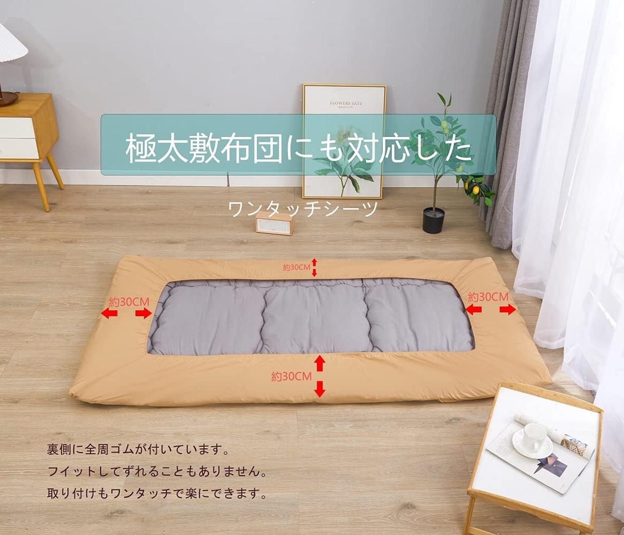 ワンタッチ式のフィットシーツ設計は、敷布団にぴったりとフィットしてずれにくく、寝返りを打っても快適な寝心地を保ちます。面倒な取り付け作業が不要で、手軽に使用開始できるのが魅力です。