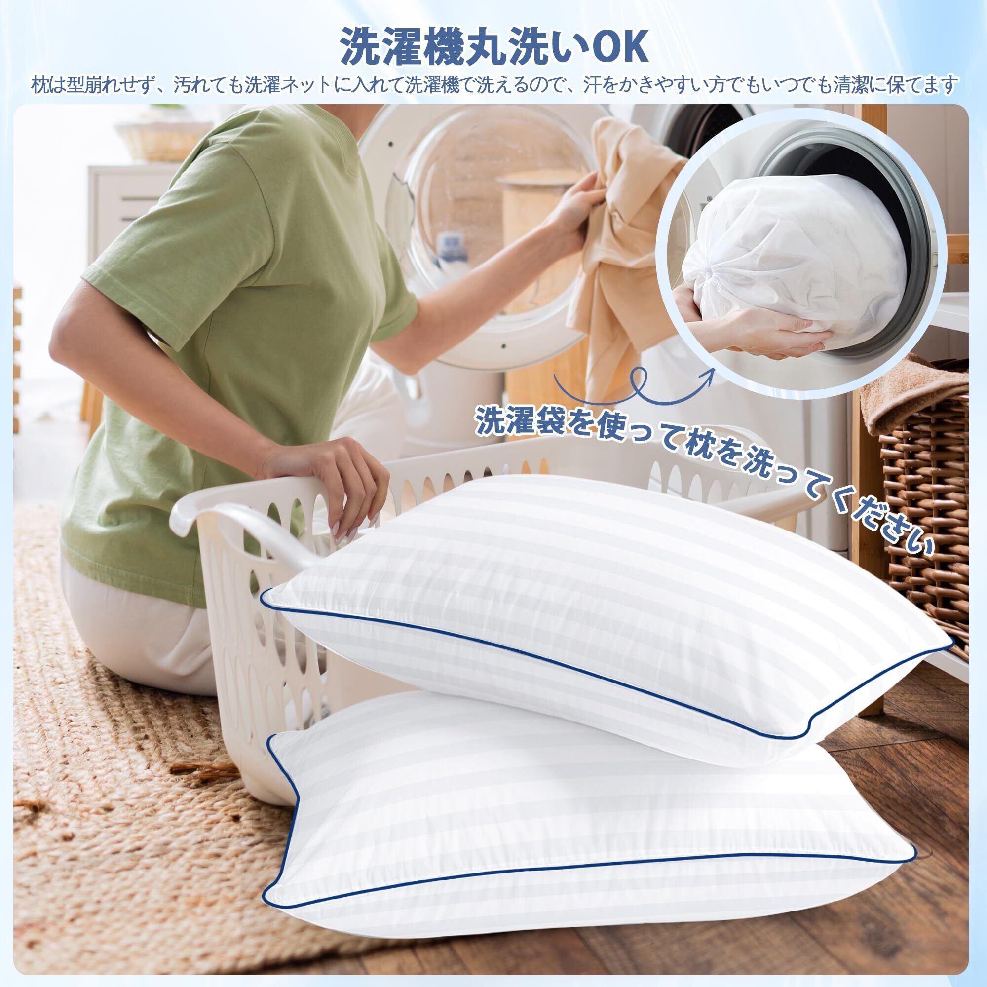 【洗えていつでも清潔】この枕は本体もカバーも丸洗い可能。洗濯ネットに入れて洗えば、いつでも清潔に保てます。洗濯後は軽く叩いて自然乾燥させれば、ふんわり感が復活。真空パックでお届けするため、開封後は12時間程度放置してからご使用ください。