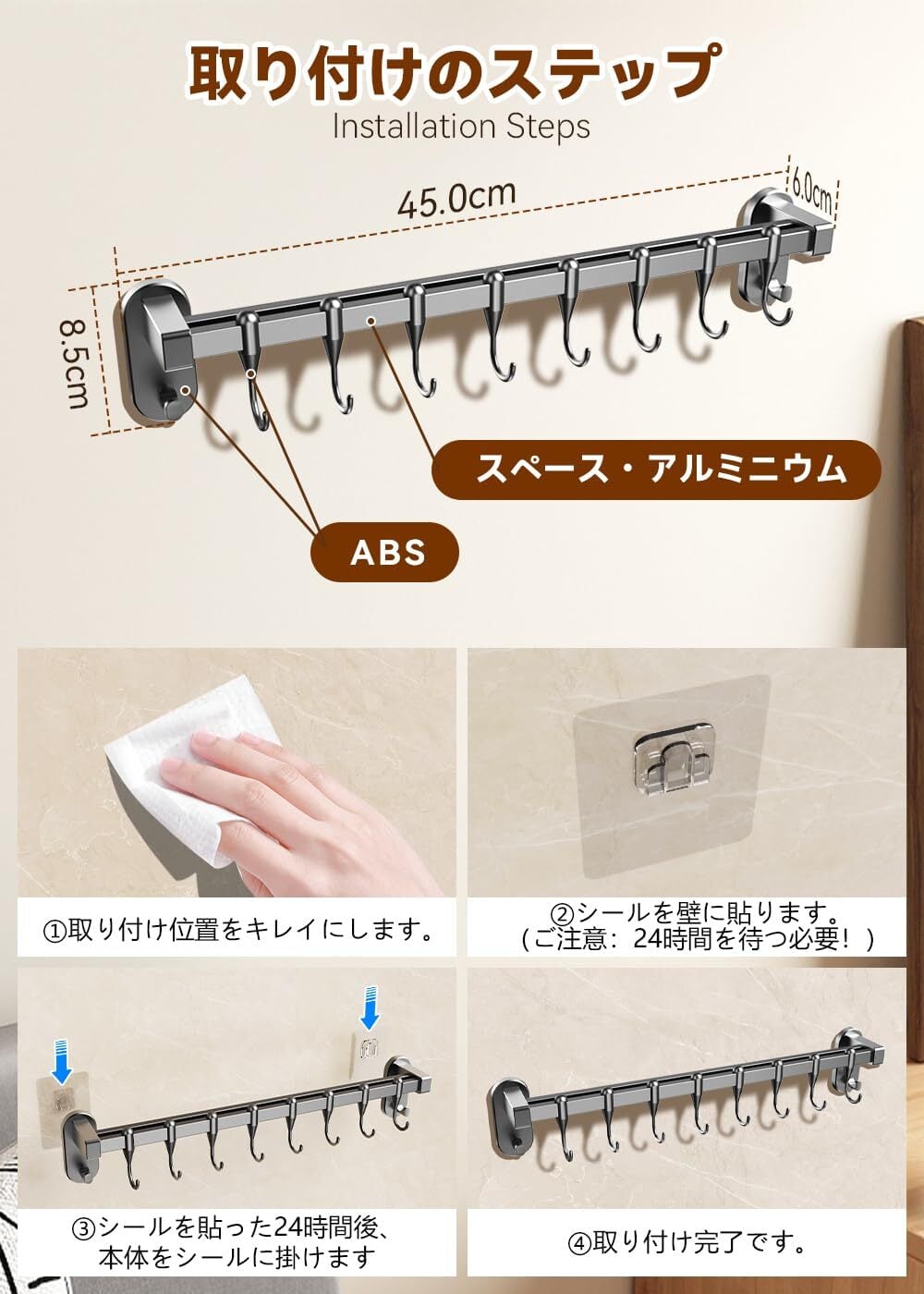 【製品仕様】重量:140g、寸法:45.0x8.5x6.0cm | 粘着シールの寸法:幅5.9x高さ9.8cm、吸着円盤の厚さ:0.4cm | 素材:(ダブルバー)アルミニウム、(コネクター)ABS、(フック)ABS、(粘着シール)PC | ご注意:ダブルバーだけはアルミ製で、ほかの部分はABS製です。ABS製の部分に嫌う方は、ご慎重に注文してください。