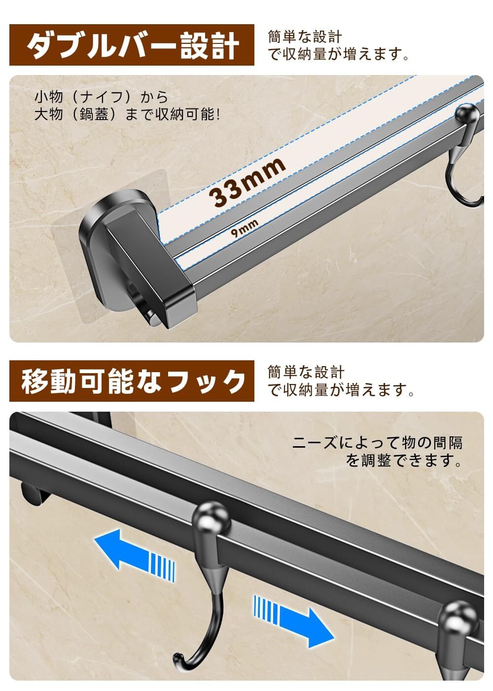 【ダブルバー&可動式フック】本キッチンツールフックはダブルバー設計を採用して、間隔距離を有効に利用して収納力を一層増やして、小物(ナイフ)から大物(鍋蓋)まで収納可能です!そして、可動式フックが付いて、フックを自由に調整することができます。タオル、お玉などを綺麗に収納することができます。有限の空間を有効活用でき、キッチンをきれいに保ち、キッチンの良い手伝いになります。