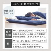【掛布団】側生地:ポリエステル100% (ピーチスキン加工、抗菌・防臭・防カビ加工)、詰め物:中空ポリエステル綿 1.6kg<br>【敷き布団】側生地:ポリエステル100%(ピーチスキン加工、抗菌・防臭・防カビ加工)、詰め物:固わた ポリエステル100% 1.5kg 巻き綿 ポリエステル1.5kg(三層固綿構造)