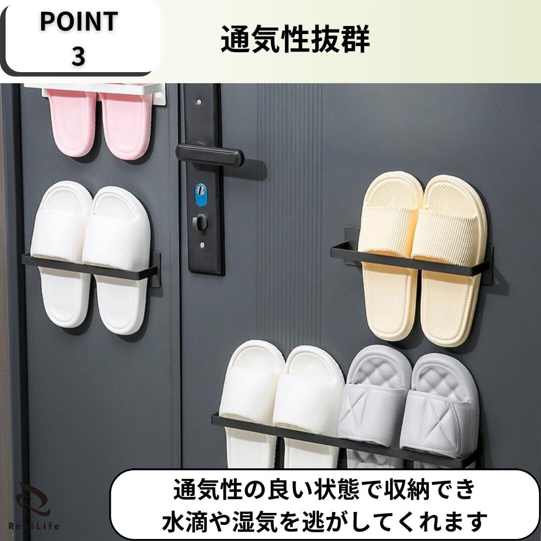 【通気性抜群】スリッパを浮かせることにより通気性の良い状態で収納でき、水滴や湿気を逃がしてくれるので清潔な状態を保つことができます。お風呂の掃除用具やバスブーツ、タオルなどをひっかけておくのにもおすすめです。