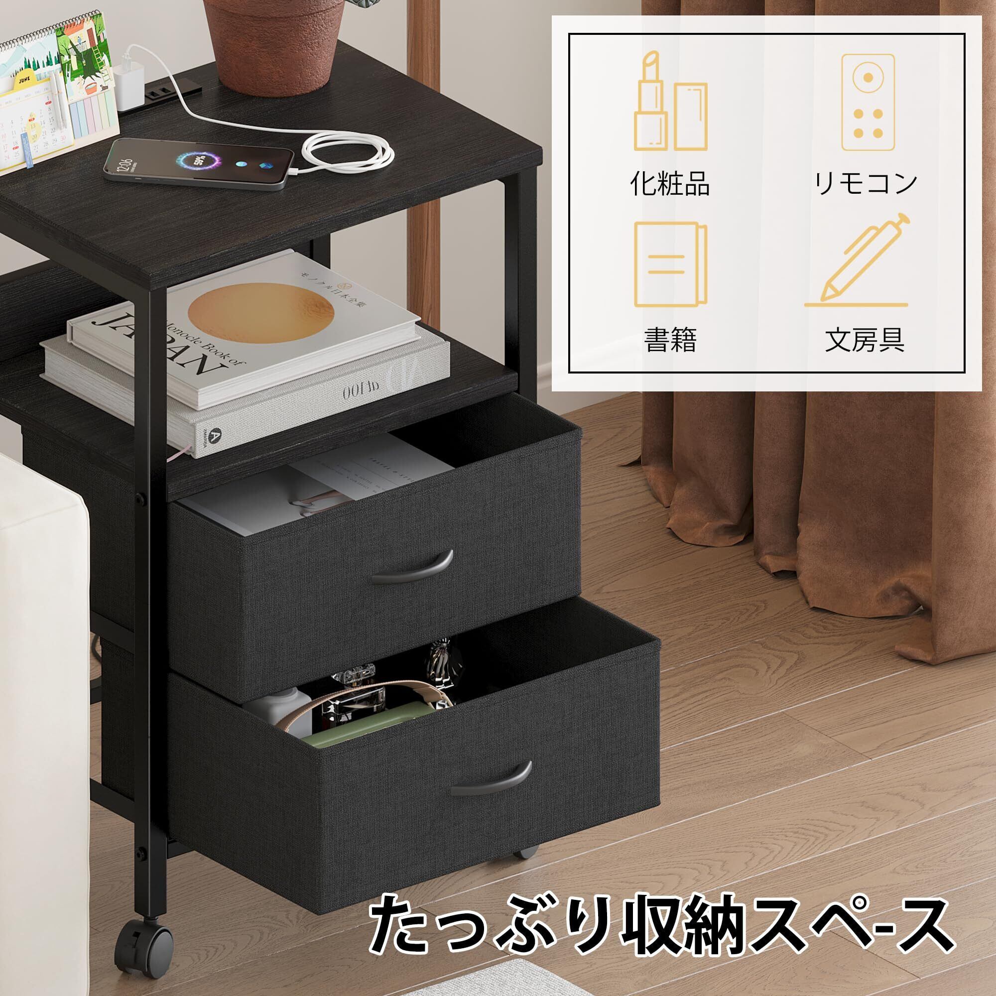 【特価セール】Fly-CTsoar サイドテーブル キャスター付き ナイトテーブル 2つ引き出し付きのベッドサイド テーブル コンセント付き 可移動ナイトテーブル ベッド横 テーブル 北欧 洋服 タンス 天板付き (ブラック, 幅40×奥行30×高さ63cm)