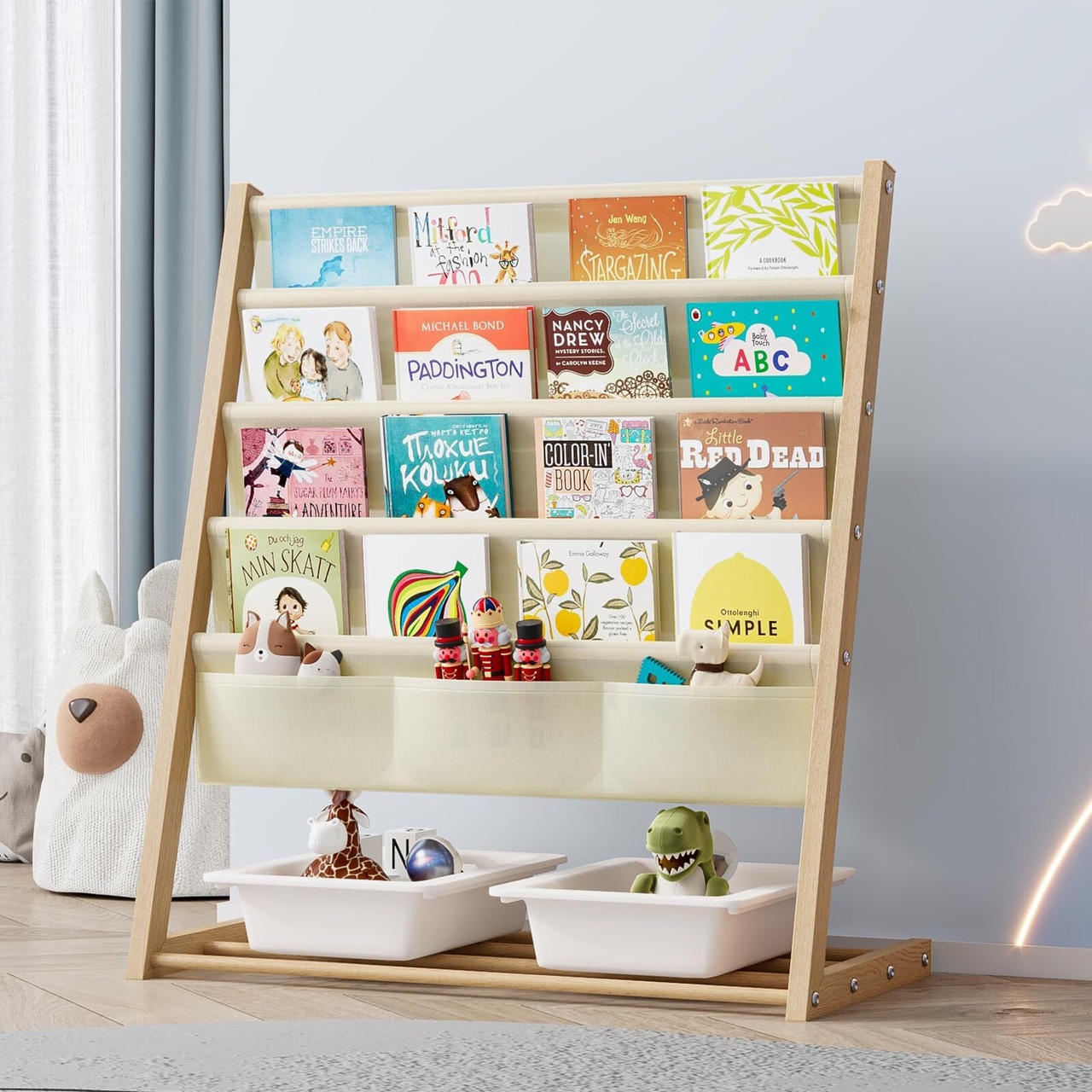 スペース節約デザイン:この絵本収納は4つの広いスロットと3つのおもちゃ収納バッグを備えており、複数の本を収納し、おもちゃ箱としても活用できます。大容量で、子供の収納スキルと整理整頓能力を鍛えます。