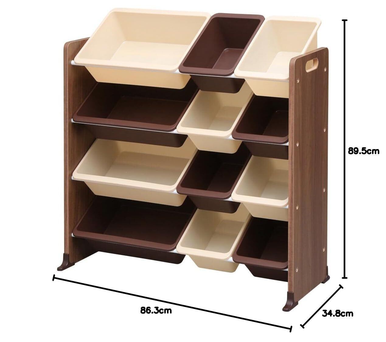 幅86.3cm、奥行34.8cm、高さ89.5cmの大きなサイズを持つ当ラックは、絵本やおもちゃを思う存分収納可能です。全てのおもちゃを一ヶ所にまとめておくことができるため、部屋をすっきりと保つことができます。