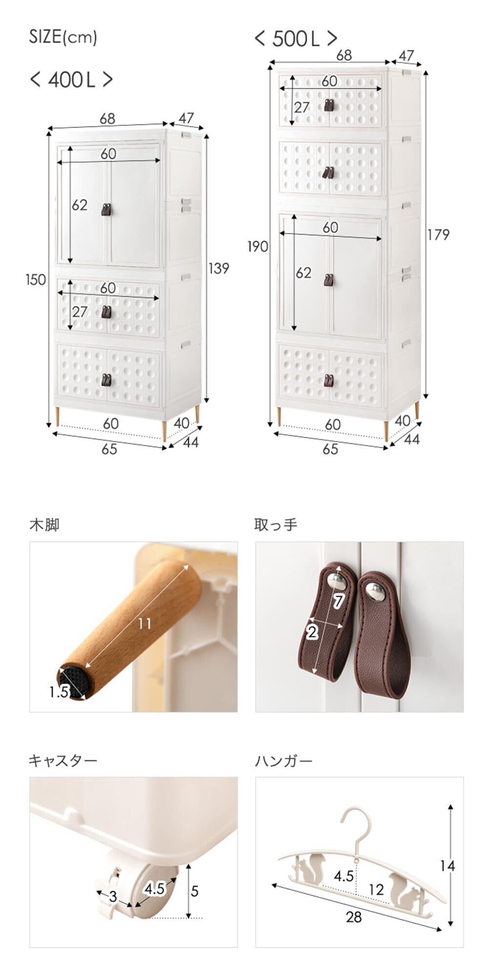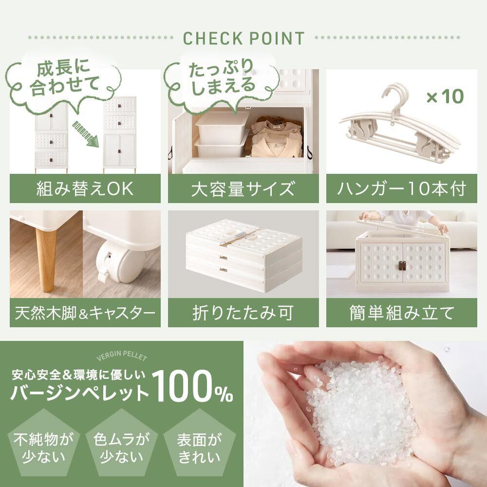 【スタッフれおのポイント】 ・成長に合わせて組み替えOK! ・たっぷりしまえる大容量収納 ・かわいいキッズハンガー×10個SET ・大きくなっても使えるシンプルデザイン ・脚部はお好みに合わせて付け替え可 …お掃除ロボ対応 天然木脚 …移動らくらく キャスター ・高品質&環境にやさしいバージンペレット100% ・安心のノンホルムアルデヒド ・工具不要!かんたん組み立て ・使わない時はコンパクトに折り畳める
