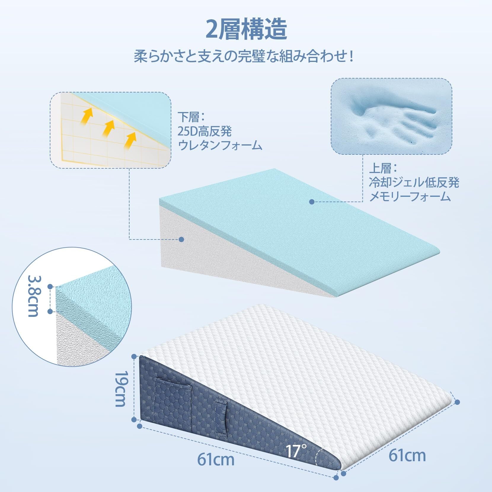 高反発層はしっかりとしたサポートを提供し、低反発層は優れたフィット感を実現。体圧分散の効果があり、体全体を優しく包み込むことで、快適な睡眠環境を整えます。睡眠の質を向上させるための理想的なアイテムです。