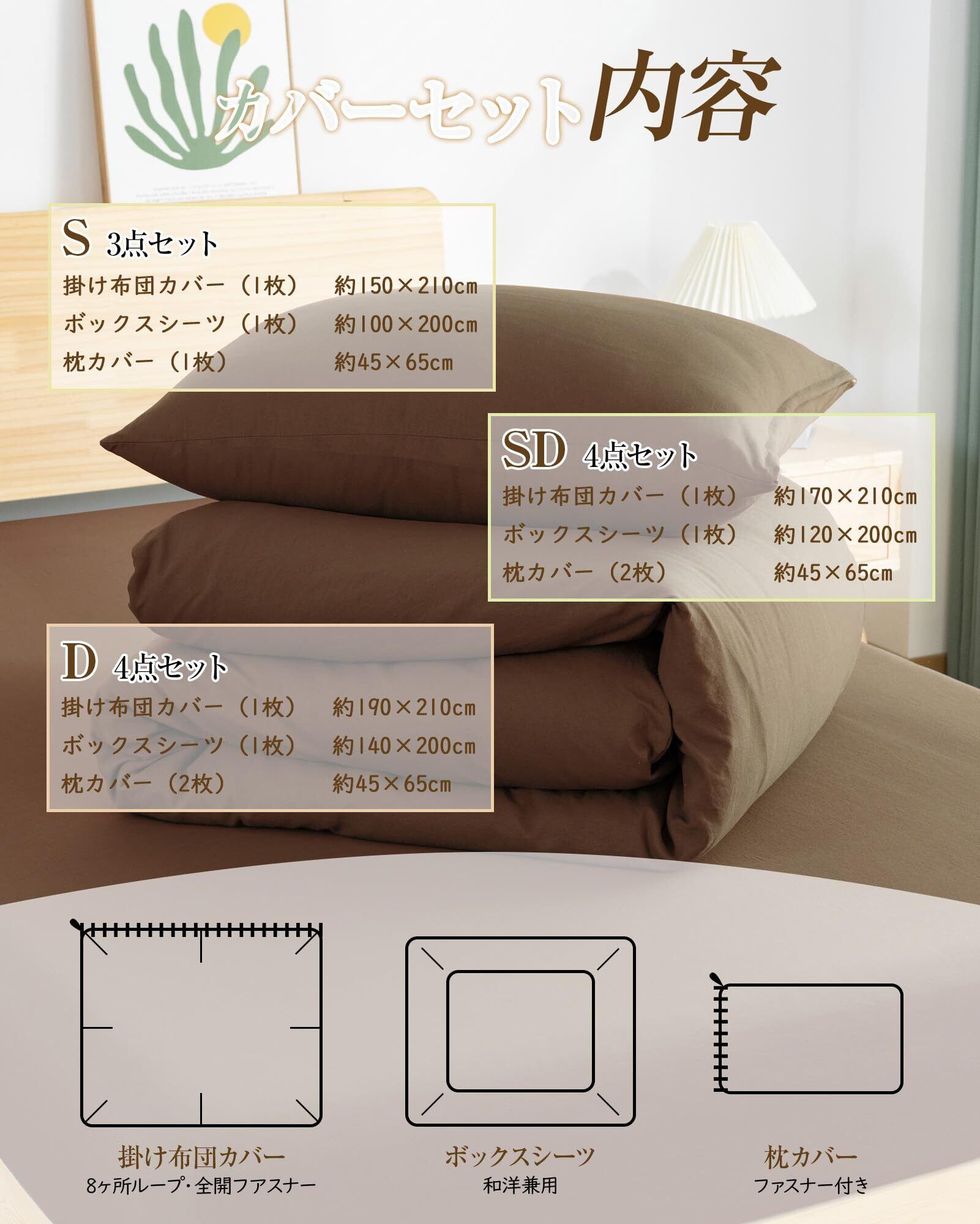 Housecover 布団カバー シングル 3点セット 寝具カバーセット【水洗い加工&超柔らかい】掛け布団カバー 洋式ベッド・和式布団兼用 ボックスシーツ 掛け布団カバー 洗いざらしシワ加工 やわらか 肌触り 吸水速乾 丸洗い 無地 シンプル オールシーズン(シングル・3点セットブラウン)