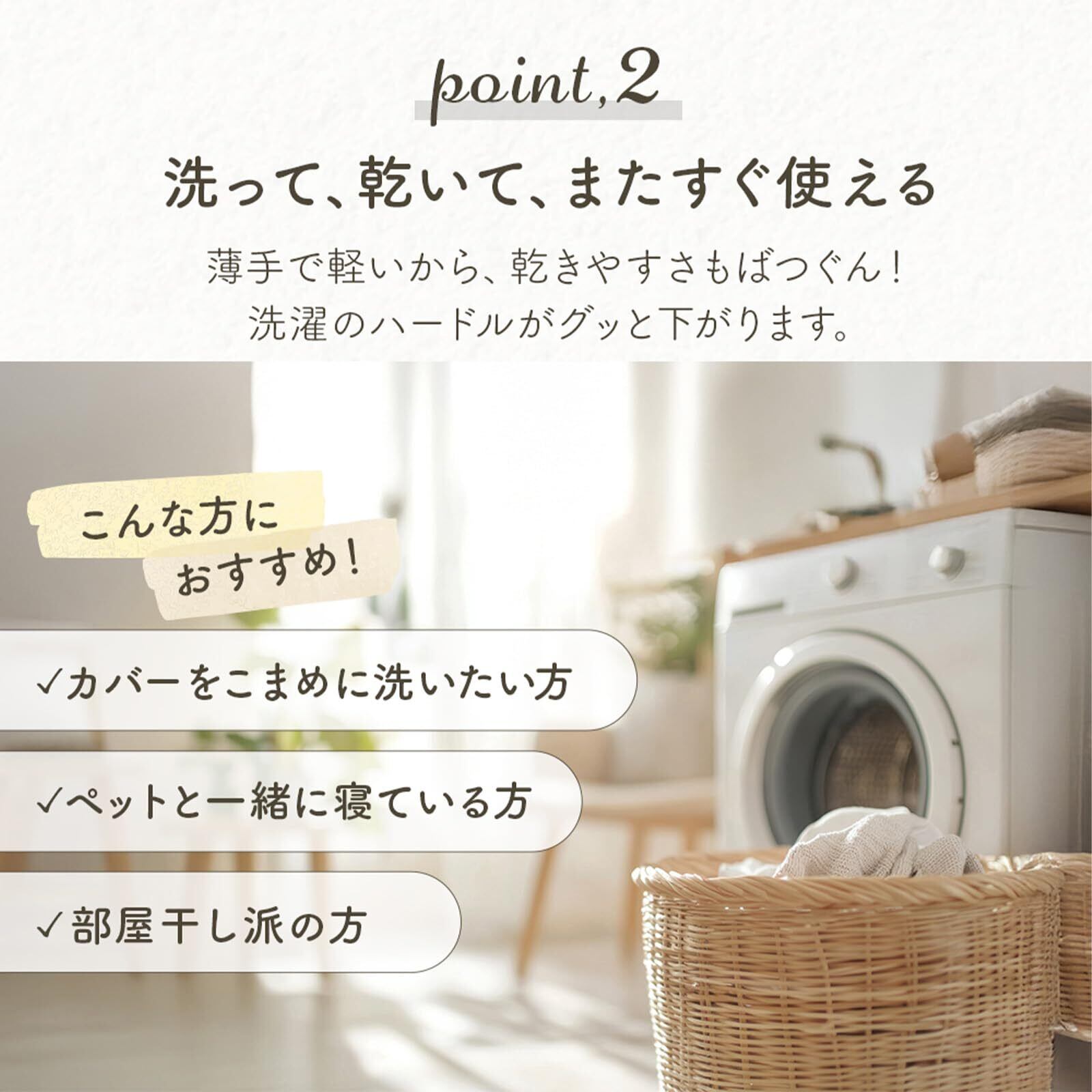 【洗ってすぐ乾く、忙しい毎日にぴったり】軽くて乾きやすいフラットシーツは、家事・育児・仕事で毎日忙しいあなたの強い味方。洗濯後もすぐに乾いてアイロン要らず。気になるしわも目立ちにくく、朝の家事をスムーズにしてくれます。